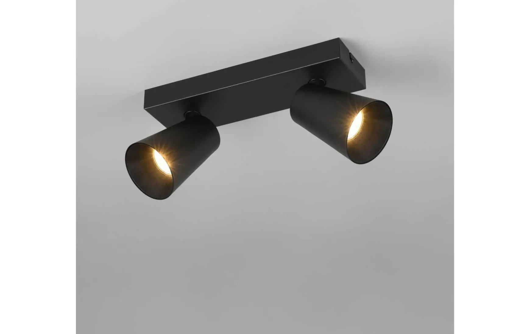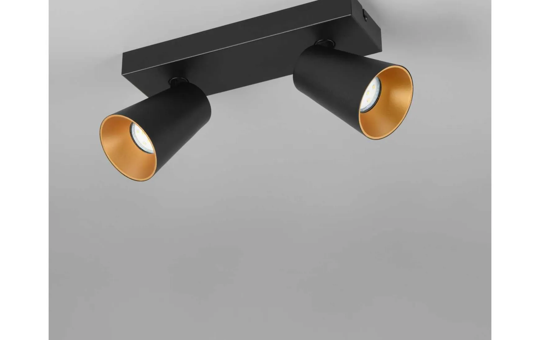 Diese Leuchte zeichnet sich durch ihr modernes Design und ihre vielseitige Einsetzbarkeit aus. Die zweiflammige Decken- und Wandleuchte ist dank der schwenkbaren Spots ideal als ergänzende Lichtquelle in der Küche oder in kleinen Räumen und verleiht Ihrem Zuhause ein gemütliches Ambiente. Das stilvolle matte Schwarz der Leuchte verleiht dem Raum eine edle Note. Die austauschbaren Cover in Schwarz und Goldfarbe bieten zusätzlich ein flexibles Spiel mit dem Licht.