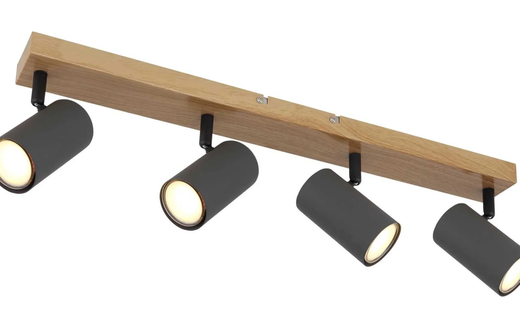 An einer rechteckigen Deckenhalterung in Holzdesign (56x6cm) befinden sich vier GU10 Fassungen, bedeckt von jeweils einem zylinderförmigen Schirm in matten Graphit.