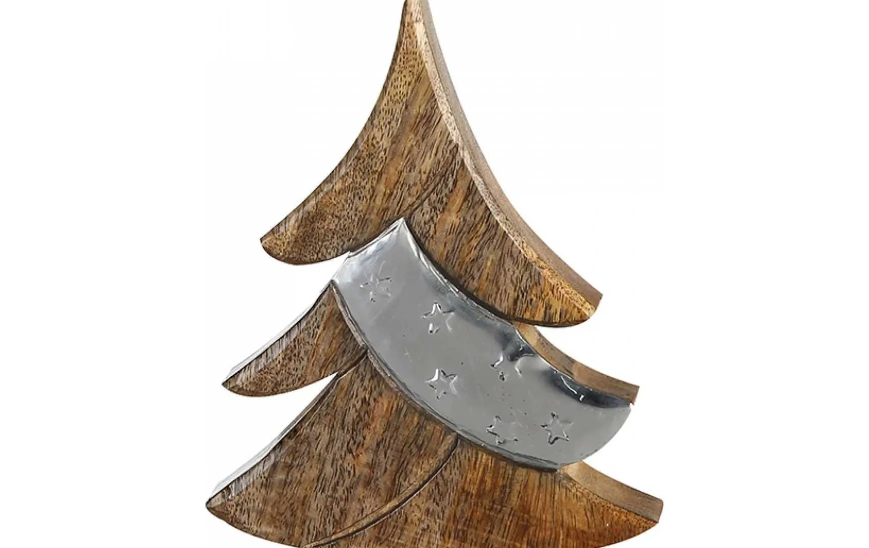 Dieser Deko-Baum aus Mangoholz, naturbelassen mit Metallstreifen und eingestanzten Sternchen verleiht Ihrem zu Hause eine weihnachtlich-winterlichen Touch.