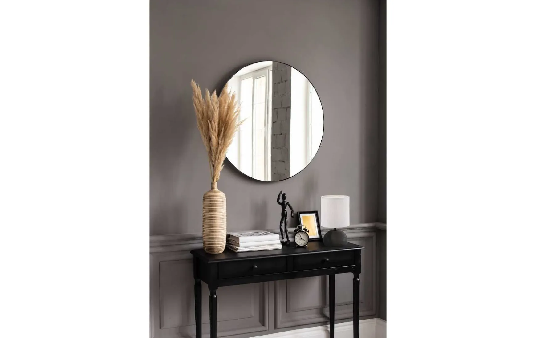Bei einem ca. 50 cm messenden Durchmesser können Sie die Ausführung in Wunschhöhe beispielsweise über einen Konsolentisch oder den Schuhschrank an der Wand montieren (Lieferumfang inklusive Aufhängungen).