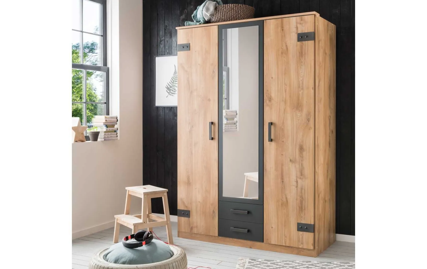 Der Kleiderschrank im angesagten Industrial-Stil begeistert mit einer durchdachten Innenaufteilung. Sein Frontdesign ist durch moderne Farben und einer schönen Holzoptik geprägt. Ausgestattet ist der Schrank zudem mit dunklen Griffen. In der Mitte befinden sich attraktive Spiegeltüren, in denen Sie Ihren Look begutachten können. Dahinter verfügt der Schlafzimmerschrank über mehrere Einlegeböden und Kleiderstangen, die viel Platz bieten. Dank einer Rasterbohrung können Sie die Einlegeböden individuell positionieren. Für zusätzlichen Stauraum ist das Schlafzimmermöbel mit geräumigen Schubkästen versehen.