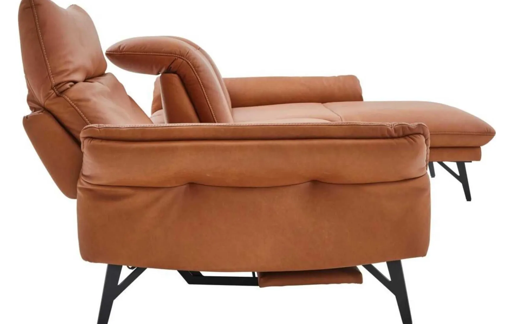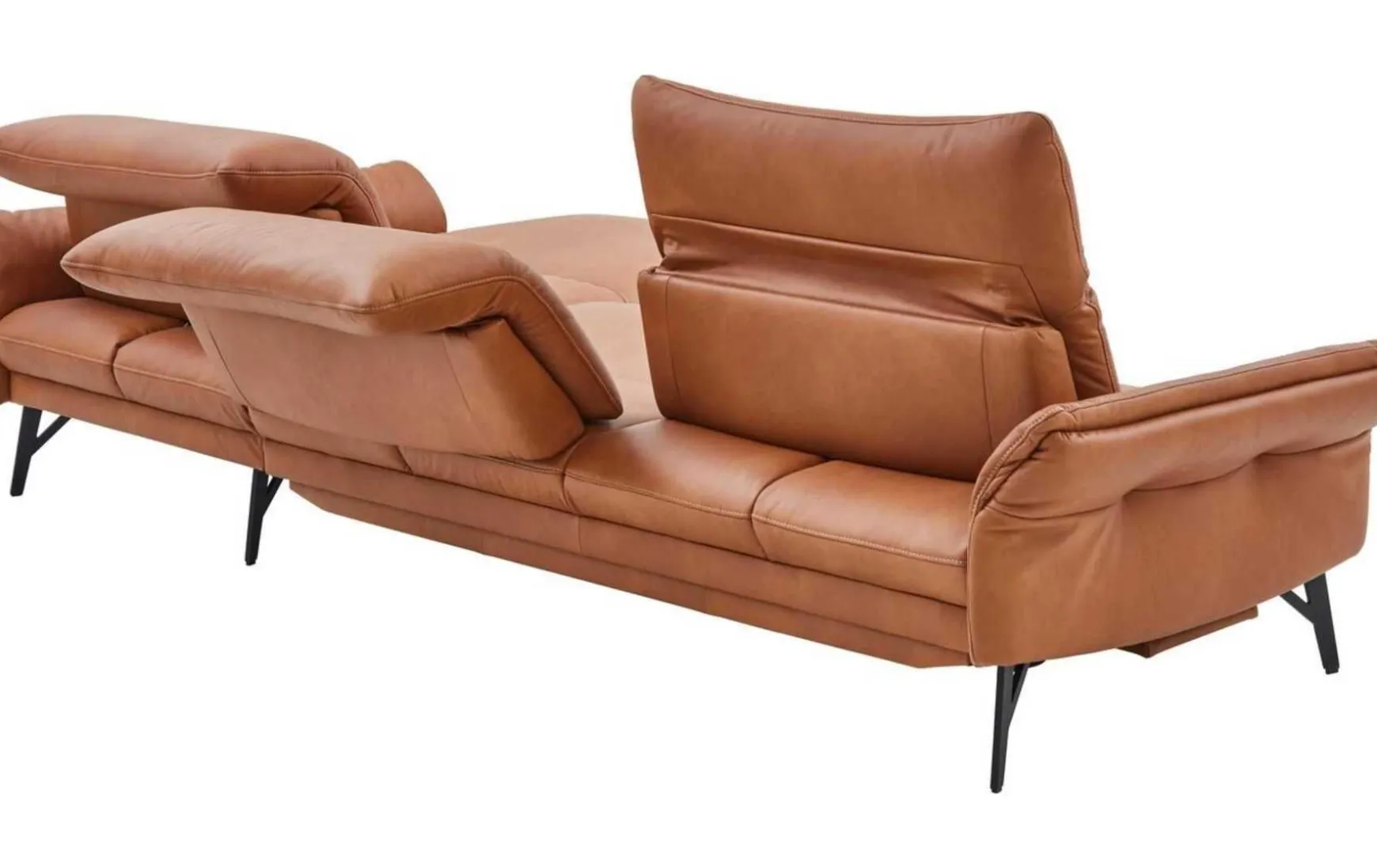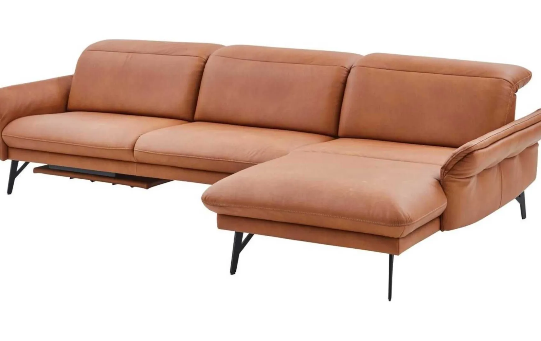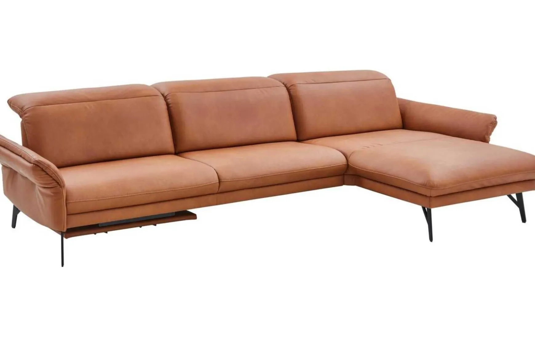 Diese Polsterecke begeistert mit erstklassigen Materialien, herausragendem Sitzkomfort und extravagantem Design. Für die stabile Basis der Couch sorgen die anthrazitfarbenen Metallfüße. Der Sitzbereich ist wie der Rücken mit braunem LongLife-Leder bezogen. Durch die gelungene Material- und Farbkombination strahlt die erstklassig verarbeitete Wohnlandschaft außergewöhnlich kreative Eleganz aus – er verleiht jeder Wohnzimmereinrichtung das gewisse Etwas und zieht die Blicke auf sich. Die Garnitur setzt sich aus einem 2,5-Sitzer mit Armteil links und einer Abschlussrecamiere mit Armteil rechts zusammen. Die Armlehnen und die Kopfteile sind manuell in Höhe und Neigungswinkel verstellbar