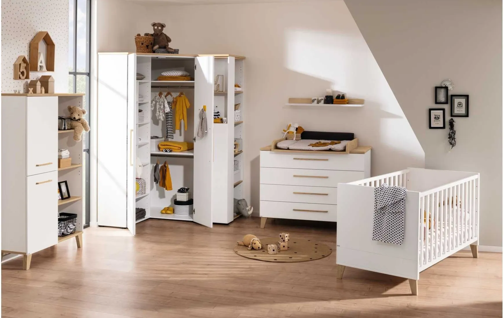 - Dazu passend bestellbar: Kinderbett, Kommode, Wickelaufsatz, Regale, Wandregal, Nachtkommode, Matratze, Zubehör: Wäsche-Unterteilung, Schubkasteneinsatz mit Untensilienschale, LED- Beleuchtung, Eck-Regal, Innenspiegel, Anstell-Regal, Garderobe, Anstell- Element