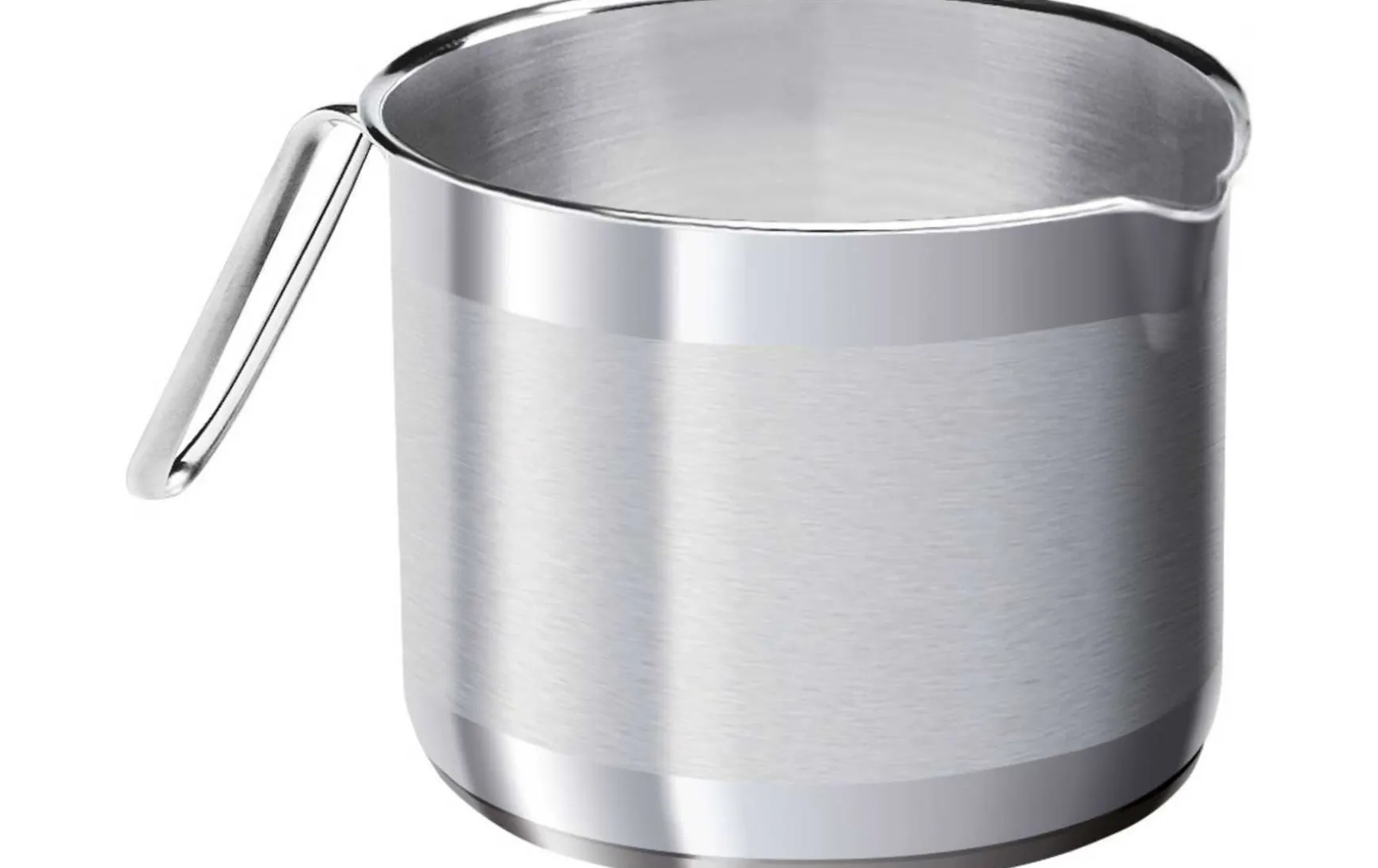 Dieser Edelstahltopf mit polierter Oberfläche verfügt über einen Ausguss, der das Ausgießen erleichtert. Unterseite mit Thermoschicht, die Wärme schnell aufnimmt und speichert.