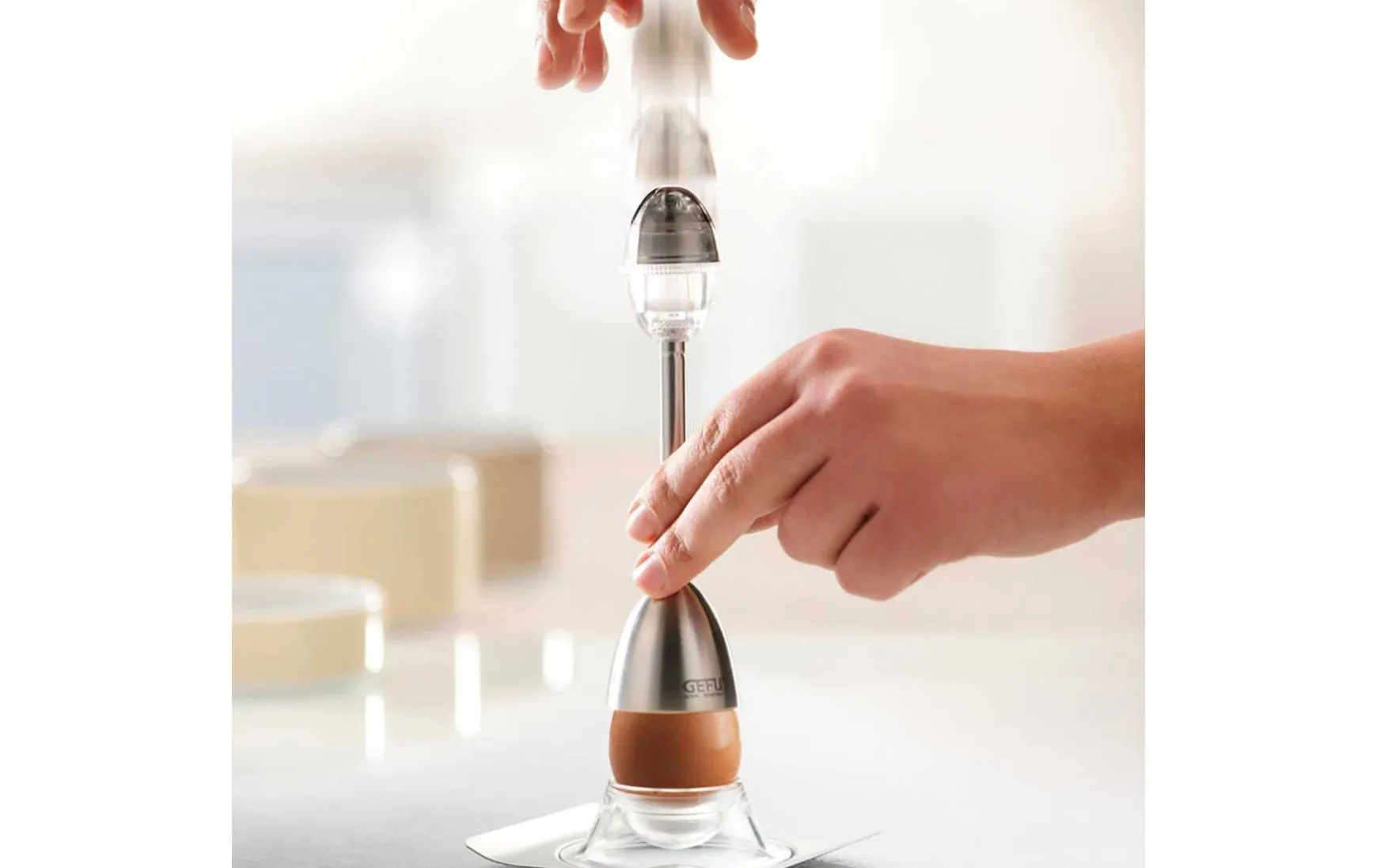 Mit diesem Eierköpfer inkl. Salzstreuer haben Sie den richtigen Helfer, um Ihr Frühstücksei zu öffnen. Sie setzen den Eierköpfer auf dem Frühstücksei auf, ziehen die Kugel nach oben und lassen sie dann einfach zurückschnellen. Das Ei bekommt dadurch rundherum eine Sollbruchstelle. Der Eierköpfer wird seitlich weggekippt, der Eierschalenkopf kann abgehoben werden und das Ei ist fertig zum Verzehr. Der Clou: der integrierte Salzstreur, der einstellbar für wahlweise kleinere oder größere Salzmengen ist. Praktischer Weise ist dieser Salzstreuer auch verschließbar.