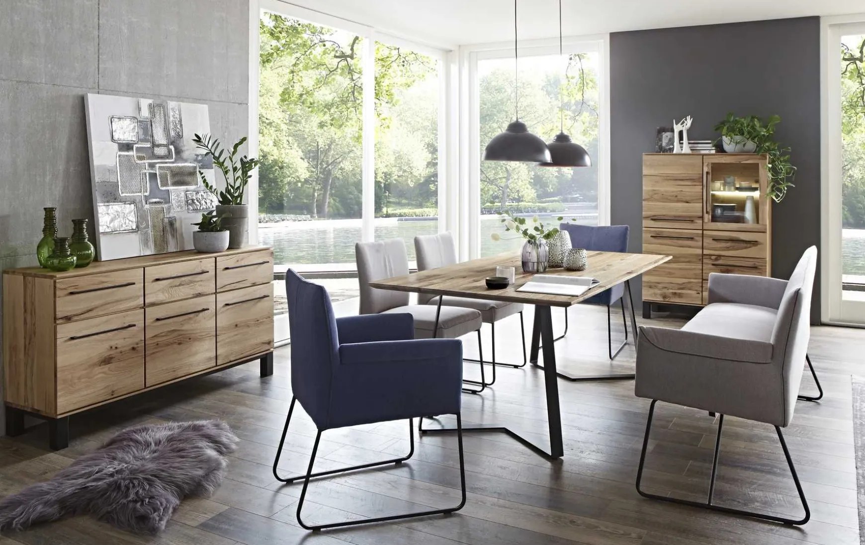 - Anmerkungen: Esstisch strukturgehobelt, Wachseffektoberfläche, Plattenprofil: facette, Design-Kufe: Eisen Schwarz, Stühle mit Wellenunterfederung, Kufengestell: Quadro-Rohr Eisen Schwarz