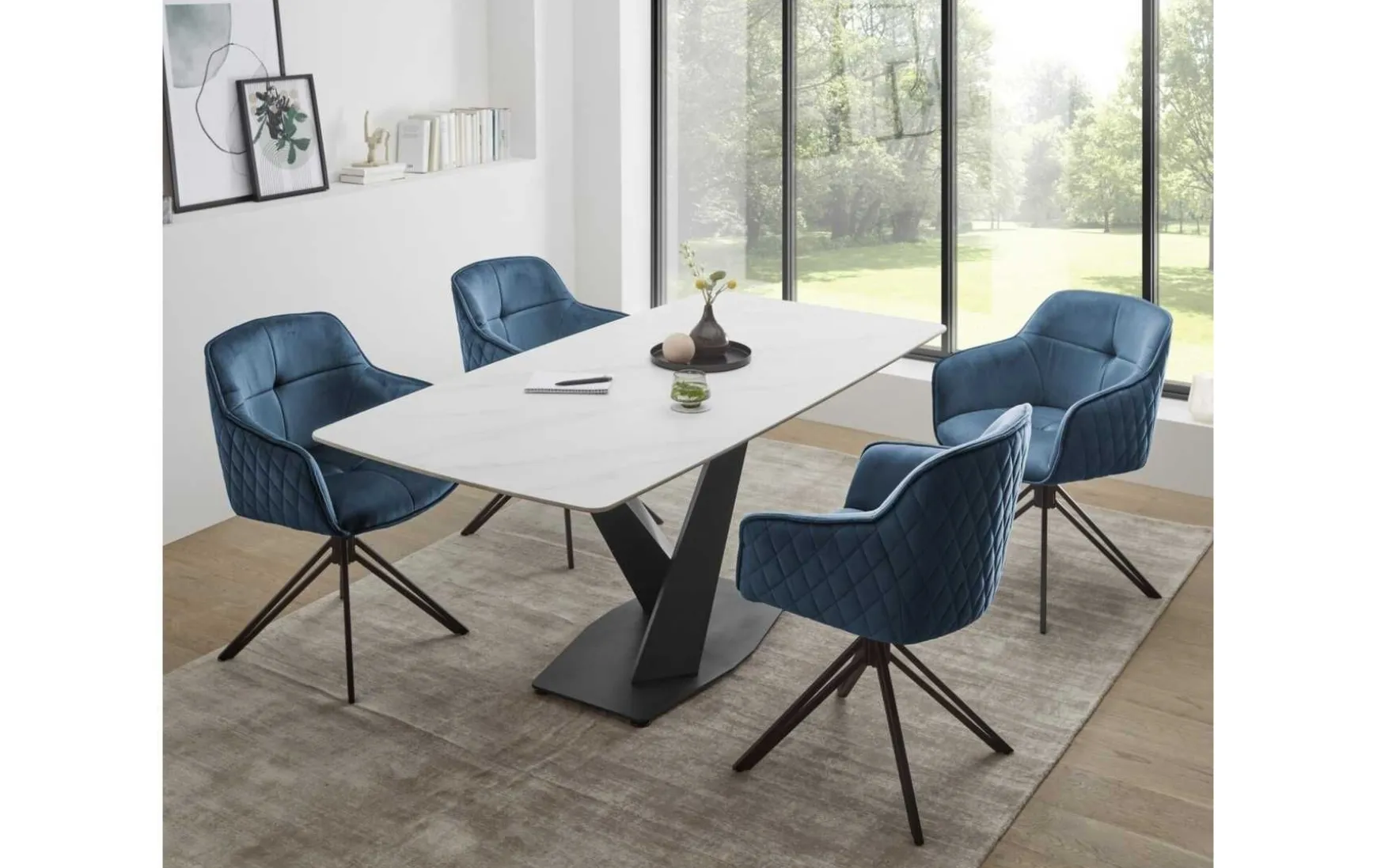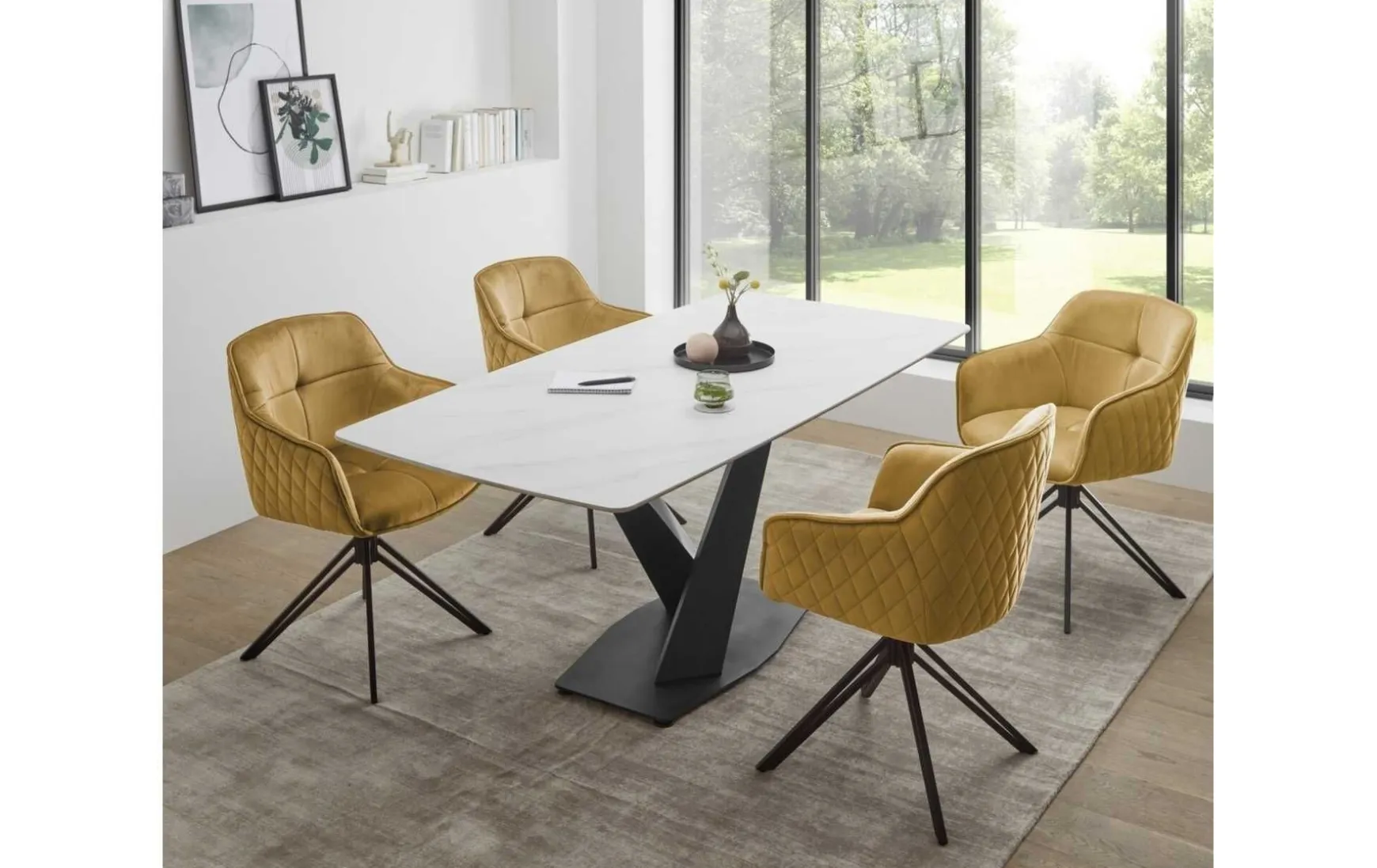 Dieser Esstisch überzeugt durch modernes Design und hochwertige Materialien und wird zum stilvollen Mittelpunkt in jedem Essbereich. Die rechteckige Tischplatte in eleganter weißer Marmoroptik aus Keramik verleiht dem Tisch eine edle Ausstrahlung und ist zugleich robust sowie pflegeleicht. Mit seinen Maßen von ca. 180 x 75 x 90 cm (B/H/T) bietet der Esstisch ausreichend Platz für gemeinsame Mahlzeiten und gesellige Runden. Das stabile, x-förmige Metallgestell in Schwarz sorgt für einen sicheren Stand und setzt einen markanten, modernen Akzent. Abgerundete Ecken erhöhen die Sicherheit und unterstreichen das harmonische Gesamtbild. Der Esstisch Ventura wird zerlegt geliefert und lässt sich dank verständlicher Montageanleitung einfach und schnell aufbauen.