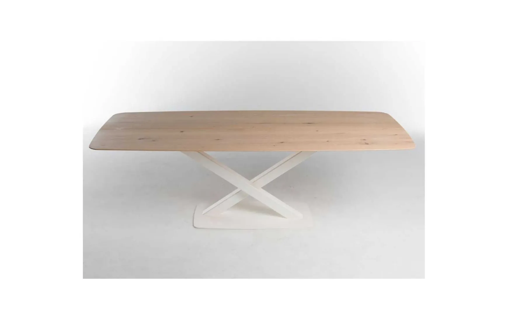 Der Esstisch ist ein absoluter Eyecatcher mit einem raffinierten Untergestell aus Stahl in Form eines unsymetrischen X. Diese auffallende Konstruktion verleiht dem Tisch seine außergewöhnliche und einzigartige Optik. Die ca. 3 cm schlanke und zierlich wirkende Tischplatte in Bootsform des Tisches in Massivholz ist mit der Kantenausführung Nr. 6 ausgeführt, was bedeutet, dass die Tischkante nach unten hin verjüngt ist. Es stehen verschiedenste Holzausführungen für die massive Tischplatte in geölter, oder aber auch lackierter Oberfläche zur Wahl. Wählen Sie die für Sie passende Tischlänge, aus den verschiedenen zur Verfügung stehenden Größen aus. Das markante Gestell des Esstisches können Sie in einer beliebigen Farbe aus der Lackkollektion in feinstruktur bestellen.