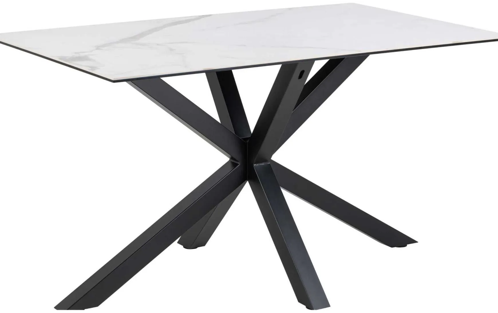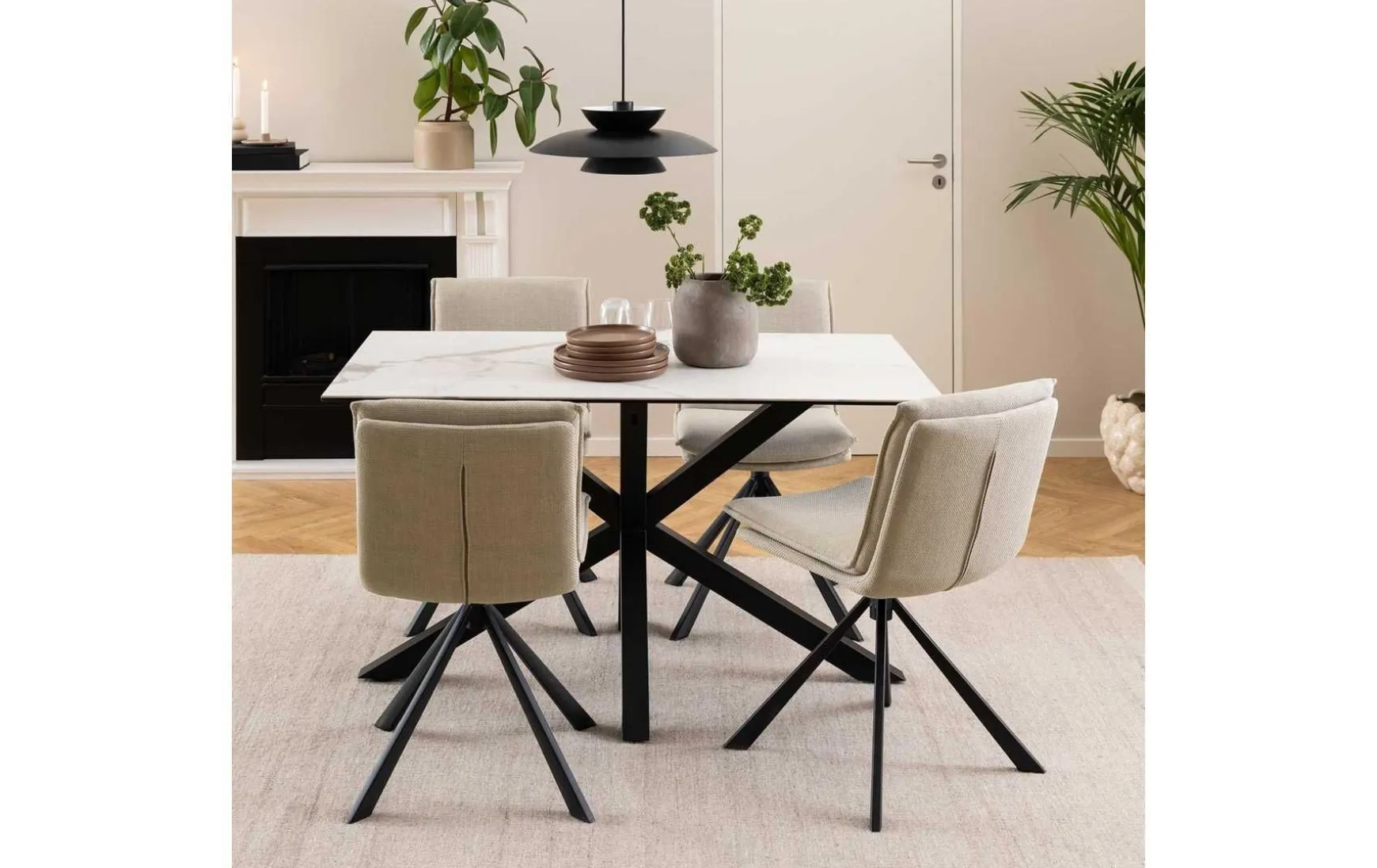 Dieser moderne Esstisch überzeugt durch kompakte Maße und ein elegantes Design und ist ideal für kleinere Essbereiche oder Küchen geeignet. Mit seinen Maßen von ca. 135 x 80 x 75,5 cm (B/T/H) bietet der Tisch bequem Platz für bis zu 4 Personen. Die hochwertige Keramikplatte in weißem Marmordekor verleiht dem Esstisch eine edle, zeitlose Optik und ist zugleich besonders robust, pflegeleicht und hitzebeständig. Das stabile schwarze Stahlkreuzbein sorgt für einen sicheren Stand und setzt einen modernen, industriellen Akzent. Dank der hochwertigen Materialkombination aus Keramik und Stahl wird dieser Esstisch zum stilvollen Mittelpunkt in jedem Esszimmer oder Wohnbereich.