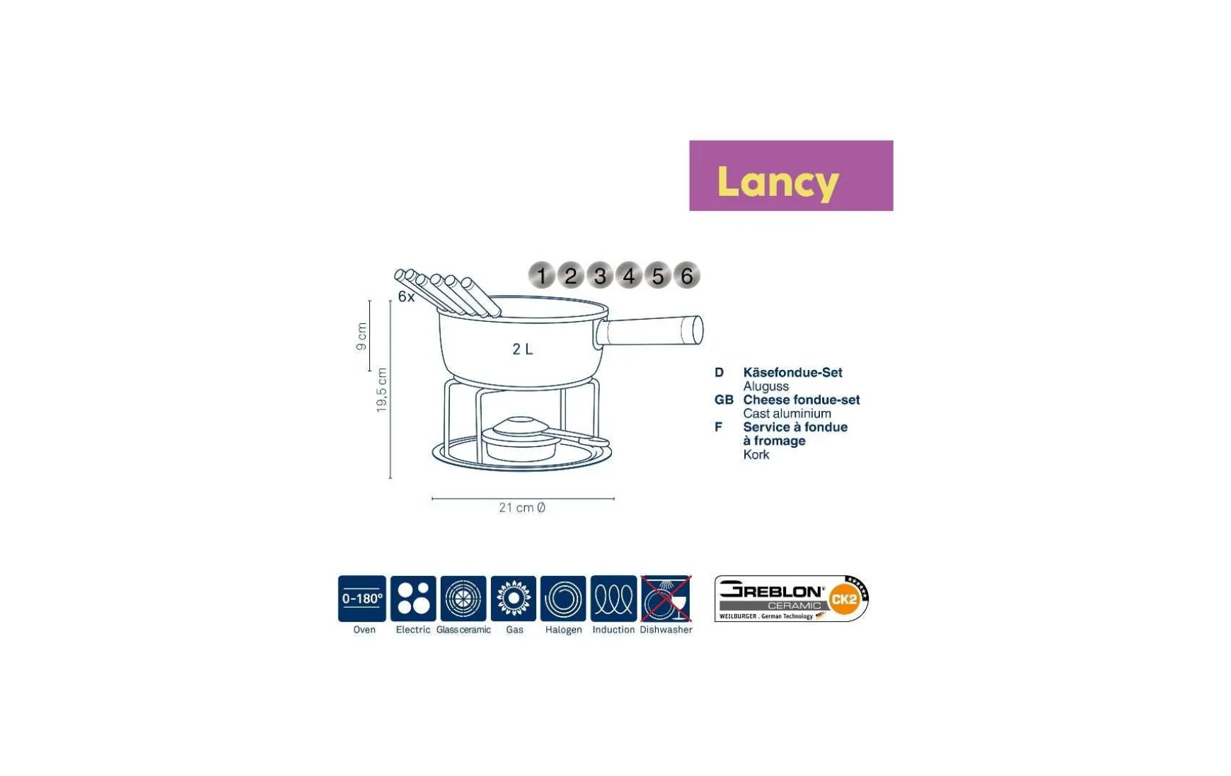 Käsefondue-Set 2L, Durchmesser 22cm, Farbe Grau. Der Topf dieses Fonduesets ist aus Aluguss mit Edelstahl-Griff. Der Griff hat einen Überzug aus Silikon, dieser sorgt dafür, dass der Topf gut in der Hand liegt und dient zudem als Hitzeschutz. Der Topf hat eine keramische GREBLON®-CK2 Beschichtung von Weilburger aus Deutschland. Diese Beschichtung ist brillant und äußerst kratzfest. Dadurch kann der Topf stark erhitzt werden ohne dass es zu Schäden am Topf kommt. Außerdem wird das Anbrennen des Käses verhindert. Der Topf eignet sich für alle Herdarten, auch für Induktion! Erhitzbar bis 180° C.