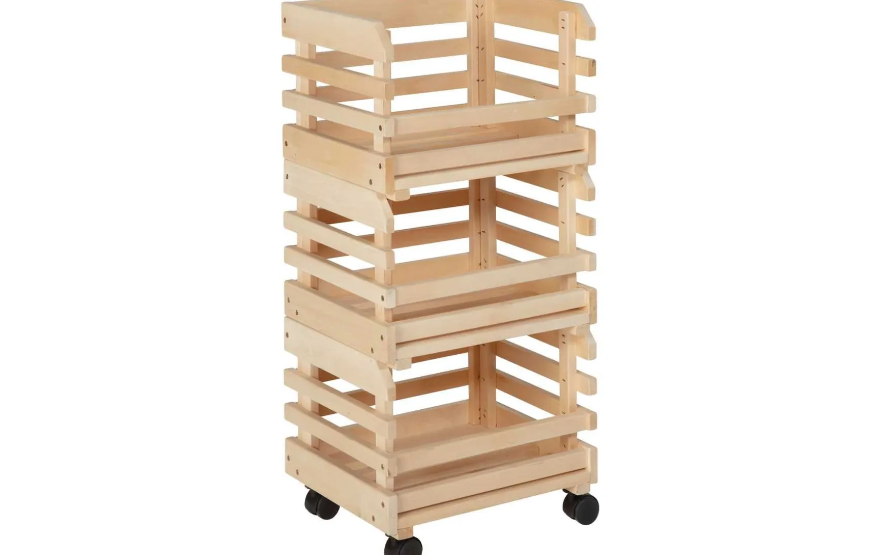 Die praktischen Stapelkisten aus massivem Holz bieten eine ideale Möglichkeit, frische Lebensmittel ordentlich und gut belüftet aufzubewahren. Dank der drei Ebenen lassen sich Obst, Gemüse oder andere Vorräte übersichtlich lagern. Das massive Holz sorgt für Stabilität und eine natürliche Optik, während die offene Bauweise eine gute Luftzirkulation ermöglicht und so zur längeren Frische der Lebensmittel beiträgt. Die Kisten lassen sich platzsparend stapeln und eignen sich hervorragend für Küche, Vorratsraum oder Keller.