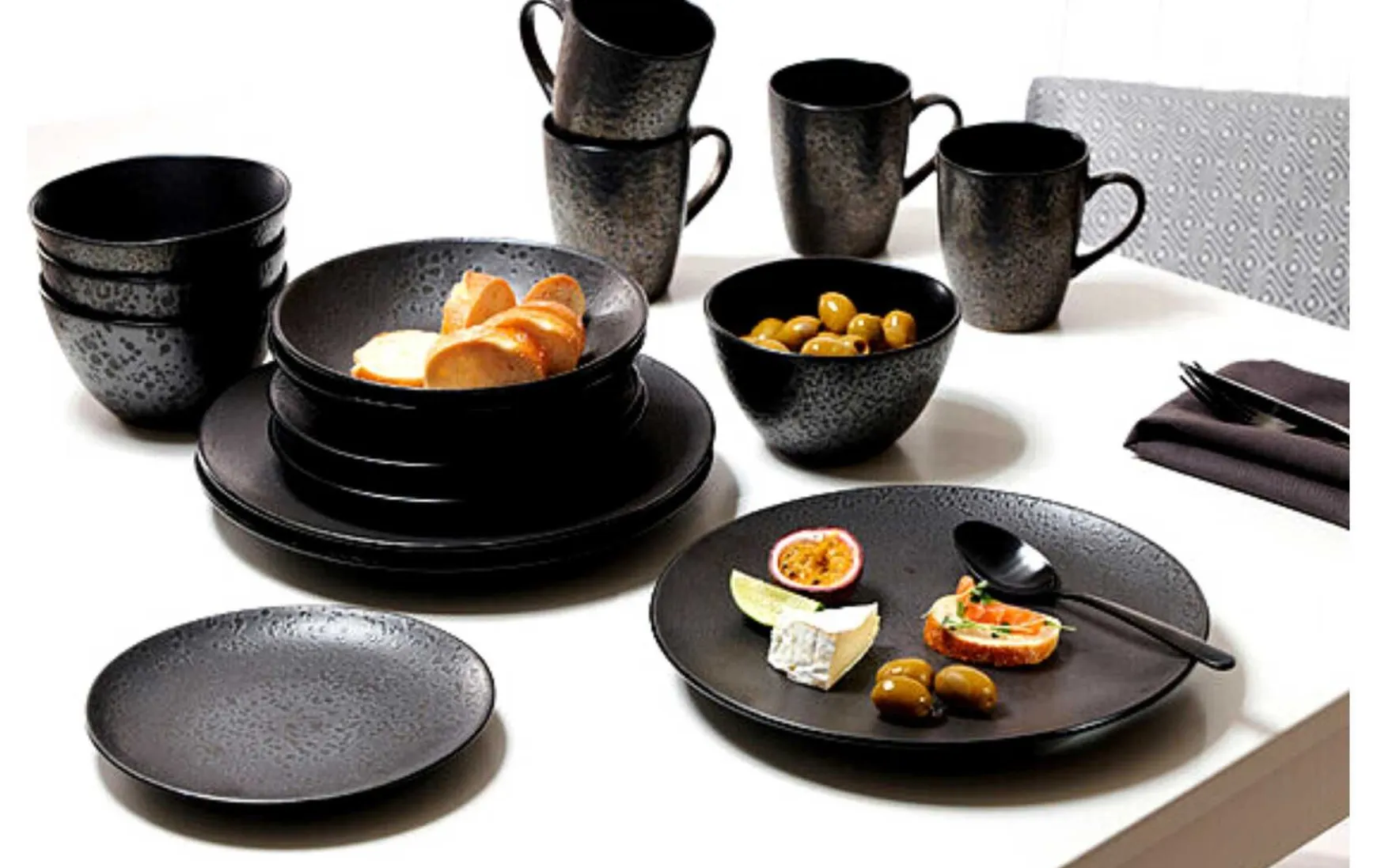 Smart und stylish: Bei diesem Frühstücksservice fasziniert die Kombination aus Flächen mit gemasertem und solchen mit glattem Finish. Die Maserung, die sich während des Brennvorgangs auf Basis einer sogenannten Reaktivglasur individuell entwickelt, macht jedes Geschirrteil zu einem Unikat. Dank der Coupeform und dem seidenmatten Schwarzton punktet das Produkt ganz nebenbei als zeitgemäßes Gourmet-Geschirr.