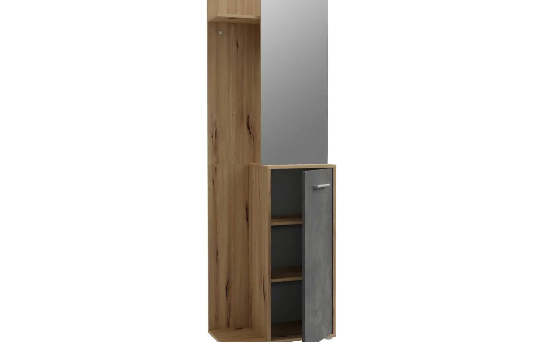 Diese moderne Garderobe in Eiche-Dekor vereint stilvolles Design mit praktischer Funktionalität. Durch ihr zeitgemäßes Erscheinungsbild und die warme Holzoptik passt sie ideal in Flur, Diele oder Eingangsbereich. Die alufarbenen Griffe setzen elegante Akzente und unterstreichen das moderne Design. Mit einer Drehtür bietet die Garderobe viel Stauraum für Jacken, Mäntel, Schuhe oder Accessoires. Die clevere Konstruktion erlaubt eine Montage rechts oder links, sodass sie flexibel in verschiedenen Raumkonzepten platziert werden kann. Gefertigt aus robustem Holzwerkstoff, ist die Garderobe langlebig und pflegeleicht – die Oberfläche lässt sich einfach trocken abwischen. Mit den Maßen von ca. 60 × 32 × 180 cm (B/T/H) ist die Garderobe kompakt, bietet aber dennoch großzügigen Stauraum. Sie wird zerlegt geliefert und lässt sich unkompliziert montieren.