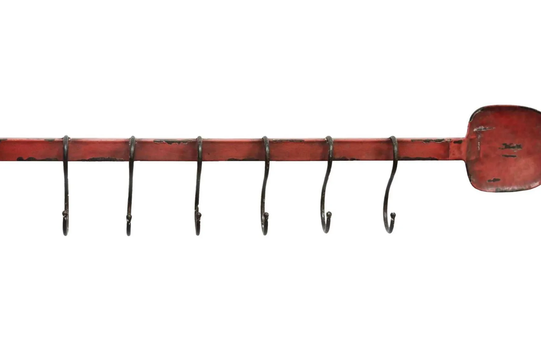 Diese außergewöhnliche Garderobenleiste im Löffel-Design ist ein echter Hingucker im Vintage-Stil. Das robuste Metallgestell in Bordeauxrot verleiht ihr einen charakterstarken Look, während die schwarzen Haken einen stilvollen Kontrast setzen. Mit sechs stabilen Haken bietet sie ausreichend Platz für Jacken, Taschen oder Accessoires und verbindet Design mit Funktionalität.