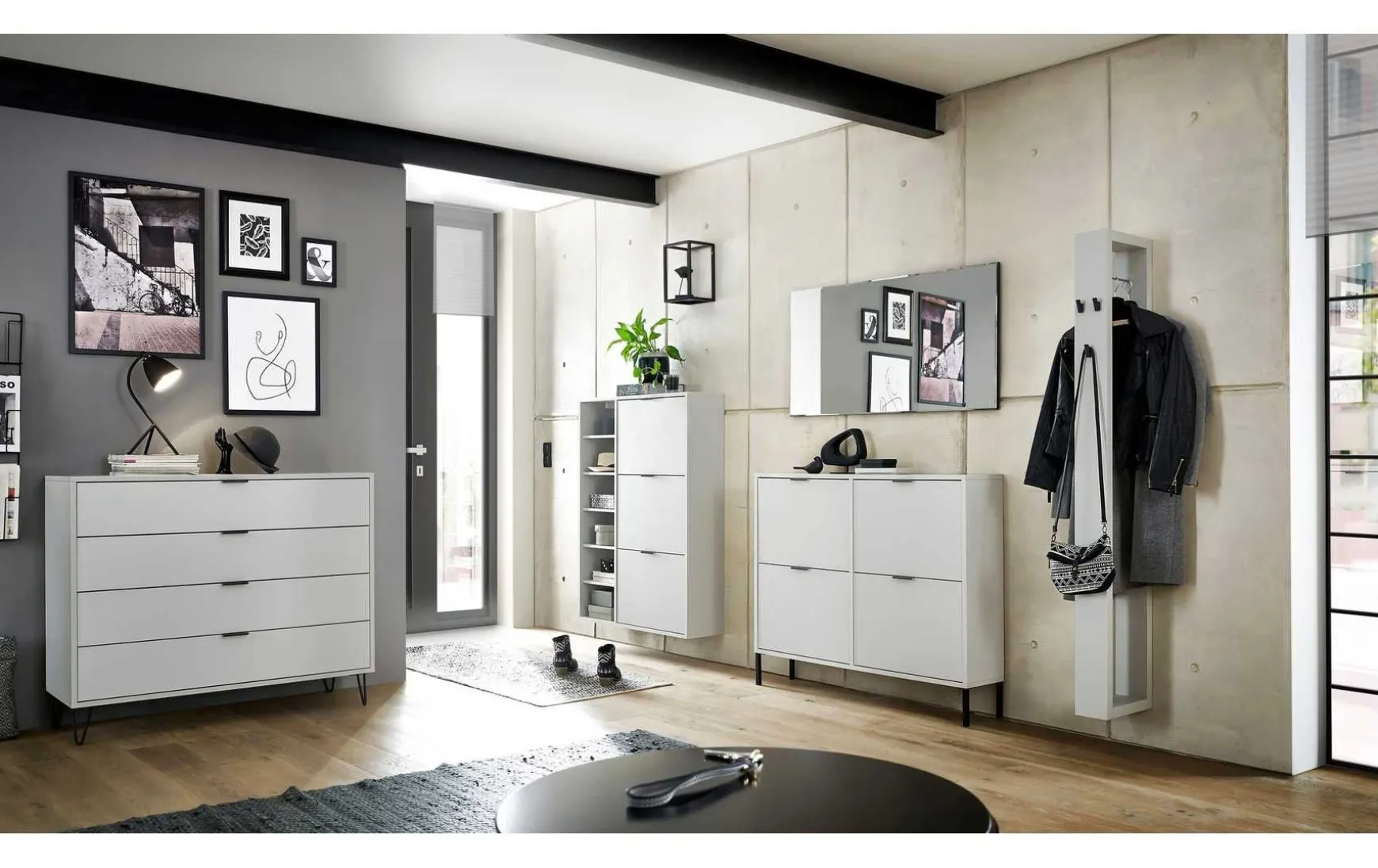 Mit ihren Mattlackoberflächen in trendigem Kreidegrau verkörpert die Wandgarderobe moderne Eleganz. Die chromfarbene Kleiderstange sowie die schwarzen Garderobenhaken runden das stilvolle Design harmonisch ab. Dank der robusten Materialien ist die Flurgarderobe langlebig und außerdem angenehm pflegeleicht.
