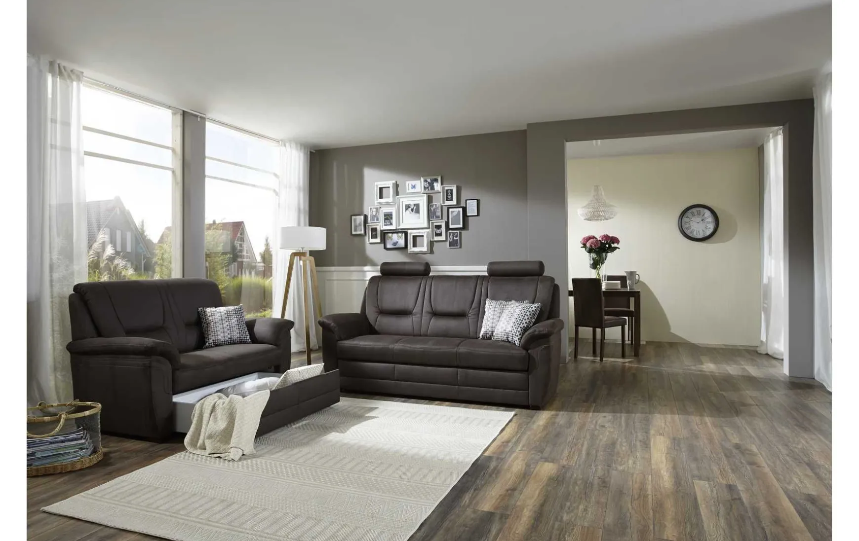 Mit einem festen Sitzkomfort, hervorgehend aus einem Super-Bonell-Federkern mit Polyätherschaum auf dauerelastischen Wellenfedern, wird Ihnen die Garnitur lange Freude am sitzen, entspannen und ausspannen bereiten und zu jeder Zeit einen herrlichen Komfort schenken. Die Garnitur ist ein Planungsmodell, die verschiedenste Lösungen für unterschiedliche Raumsituationen und Geschmäcker bietet. Sie können dieses Modell nach Ihren Wünschen in unseren Filialen individuell planen lassen. Wir beraten Sie gerne.