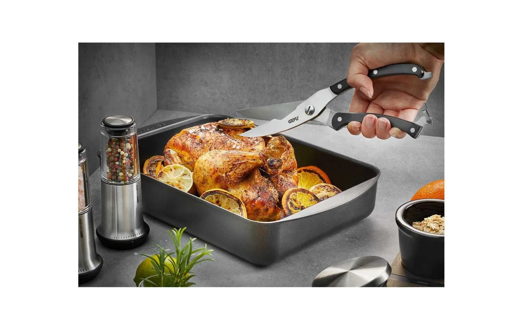 Geflügel mühelos zerteilen wie der Profi – das gelingt Ihnen mit dieser Geflügelschere. Sie ist extrascharf, liegt gut in der Hand und ist, durch einen innovativen Federmechanismus im Scherengelenk, besonders leichtgängig. Für das Schneiden von Knochen hat sie eine praktische Auskerbung und für die sichere Aufbewahrung einen Sicherheitsverschluss.