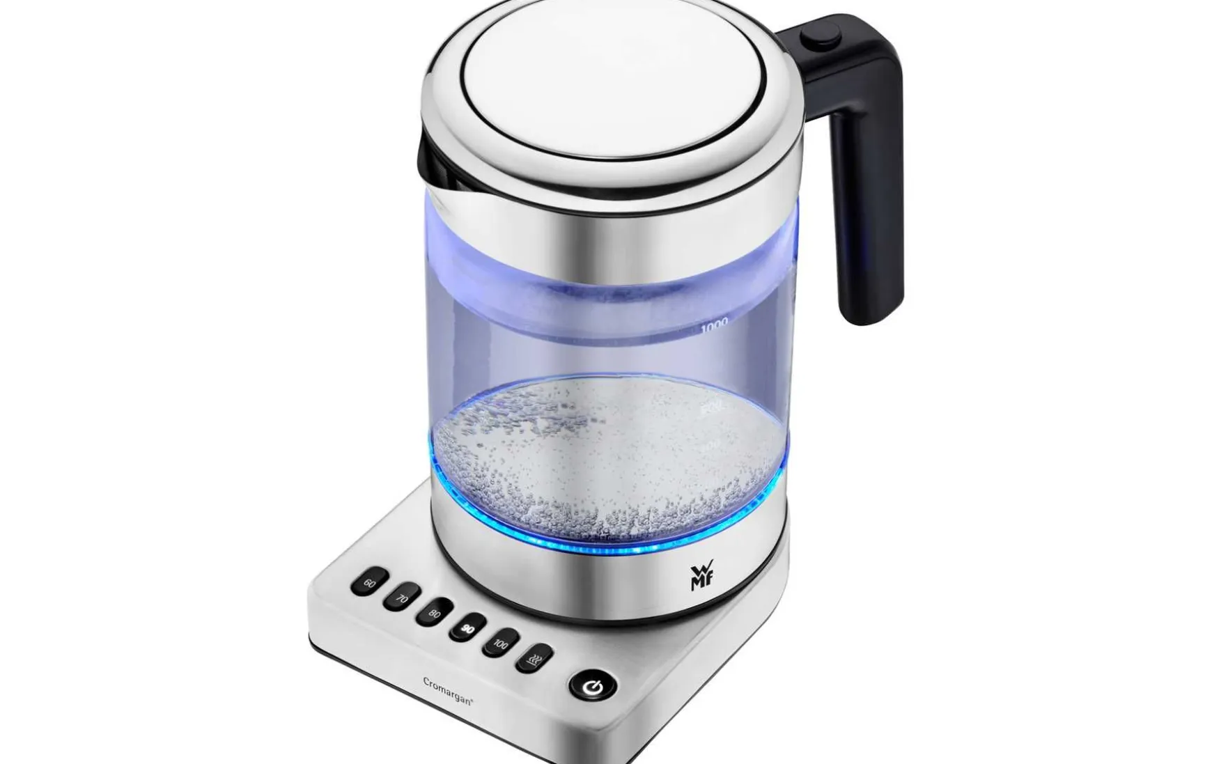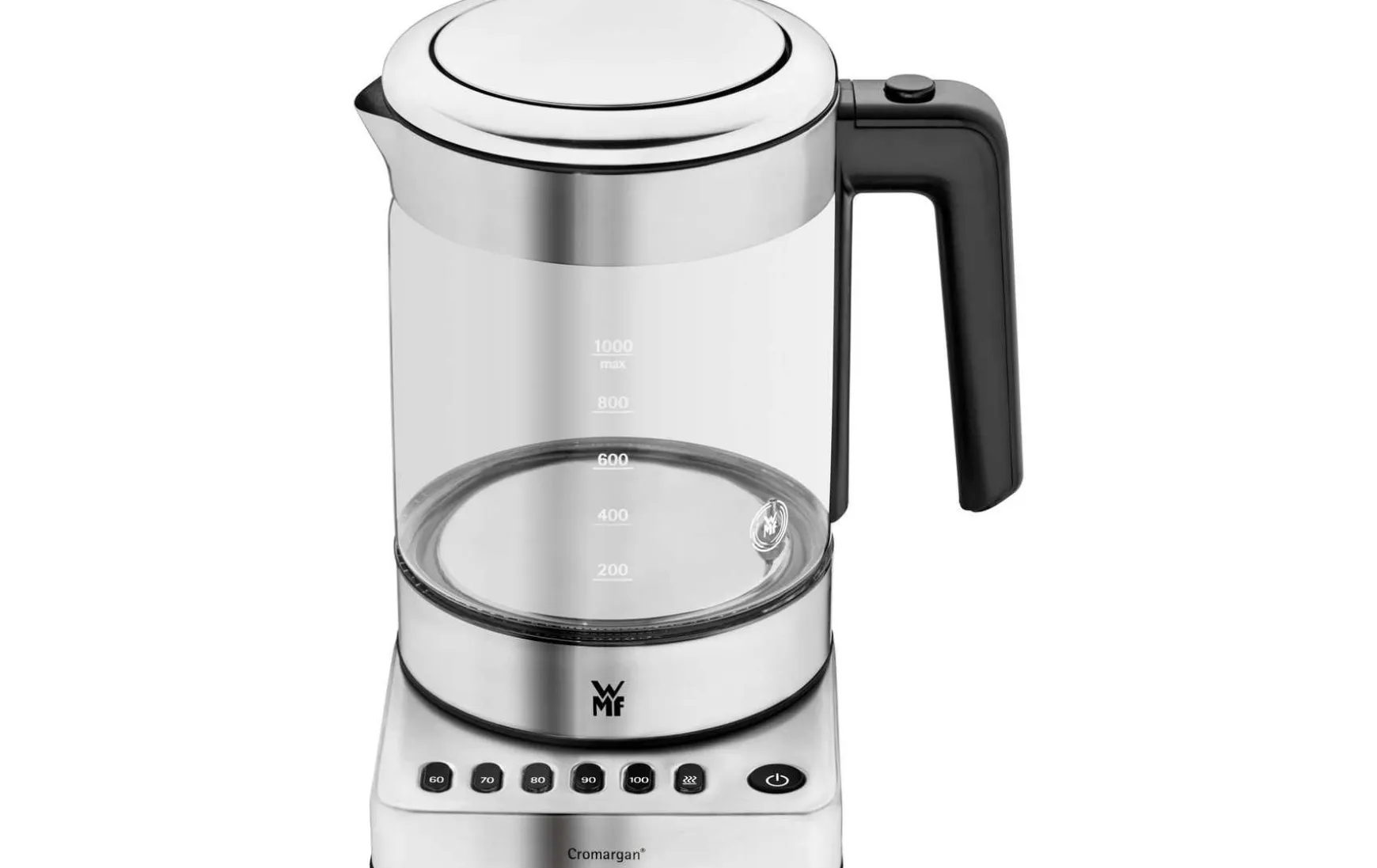 Aus hochwertigem, extrem hitze- und temperaturwechselbeständigem WMF Glas, kann dieser elegante Wasserkocher auch Tee zubereiten.