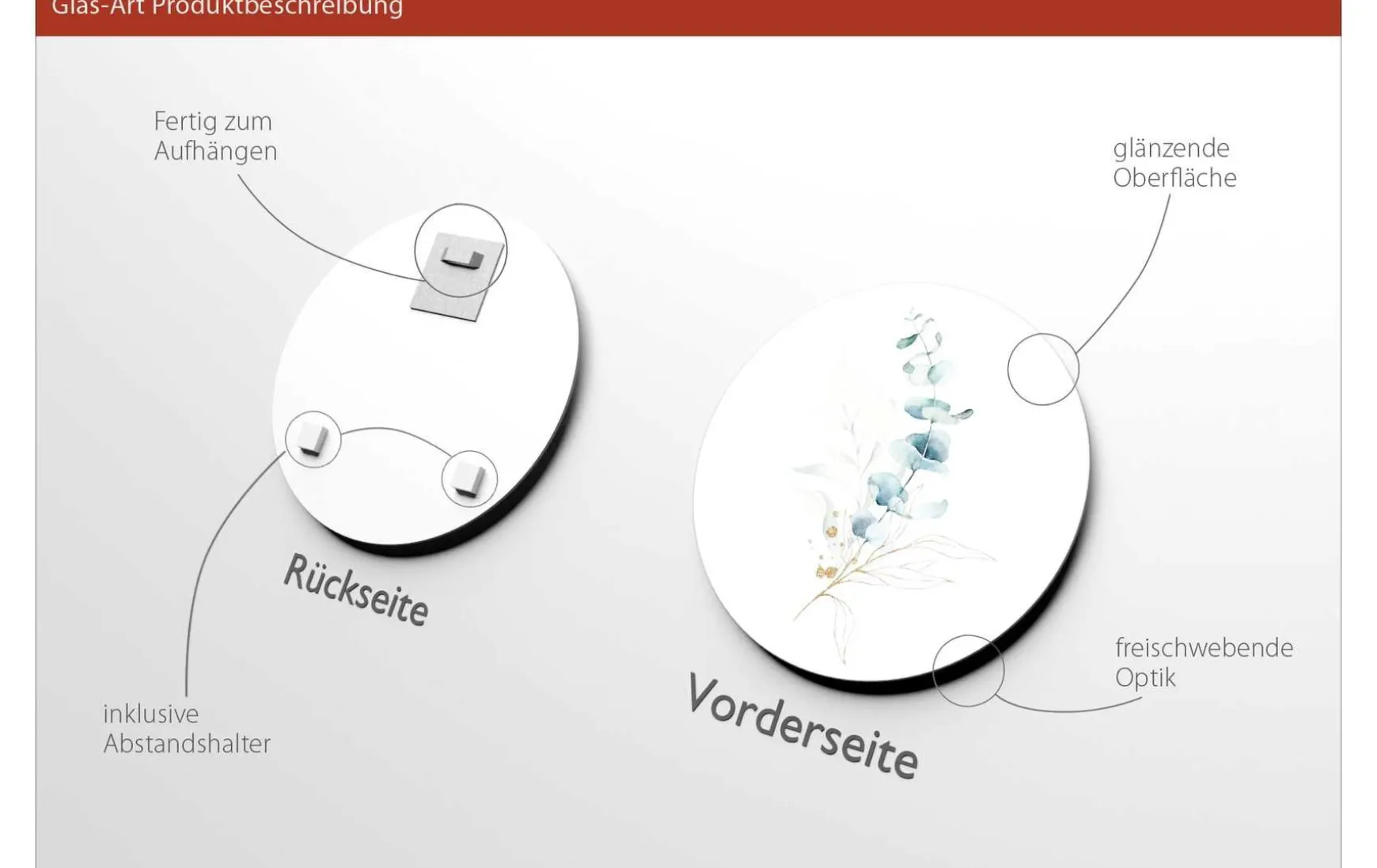 Brillanter Druck hinter Glas in freischwebender Optik, in angesagter runder Qualität.