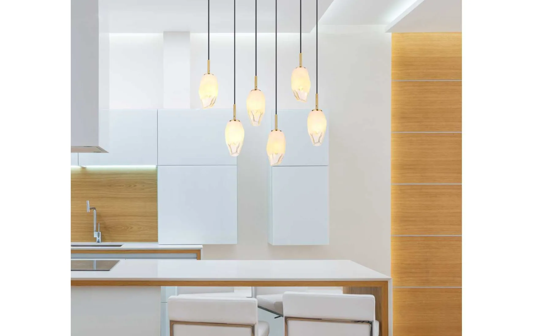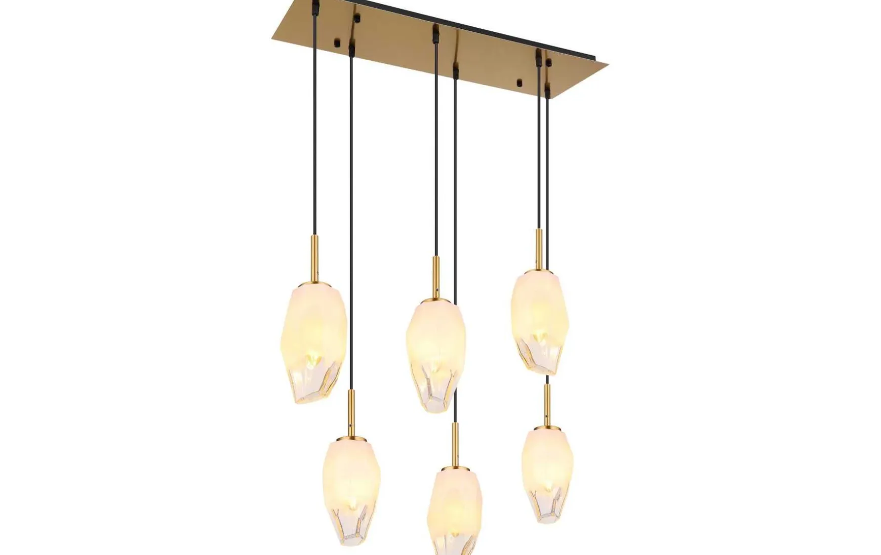Hängeleuchte Metall messingfarben, Glas opal, klar, Kabel PVC Schwarz, Höhe kürzbar, LxBxH: 720x240x1200mm, exkl. 6x E14 7W 230V