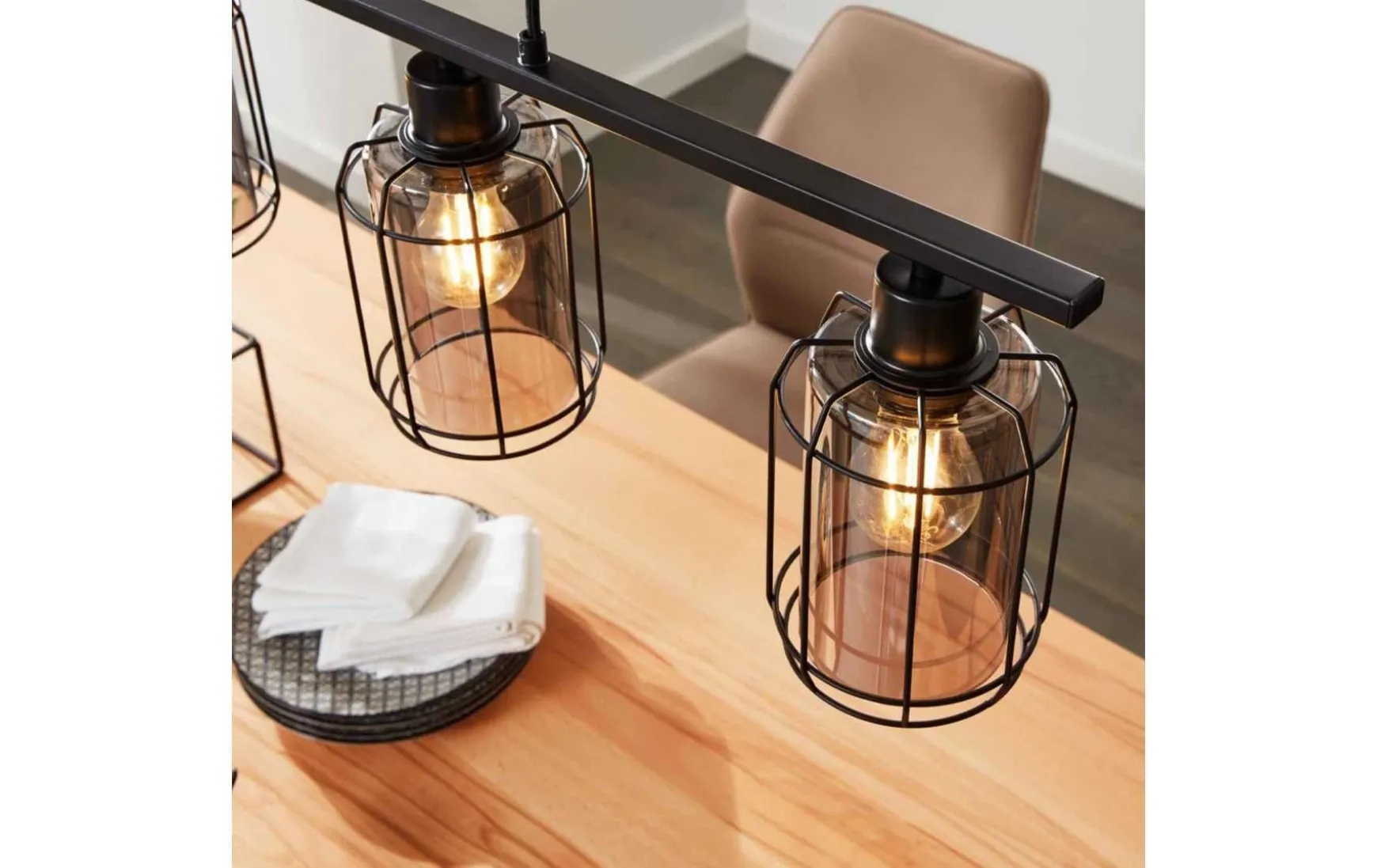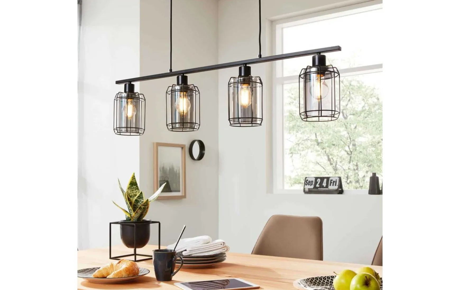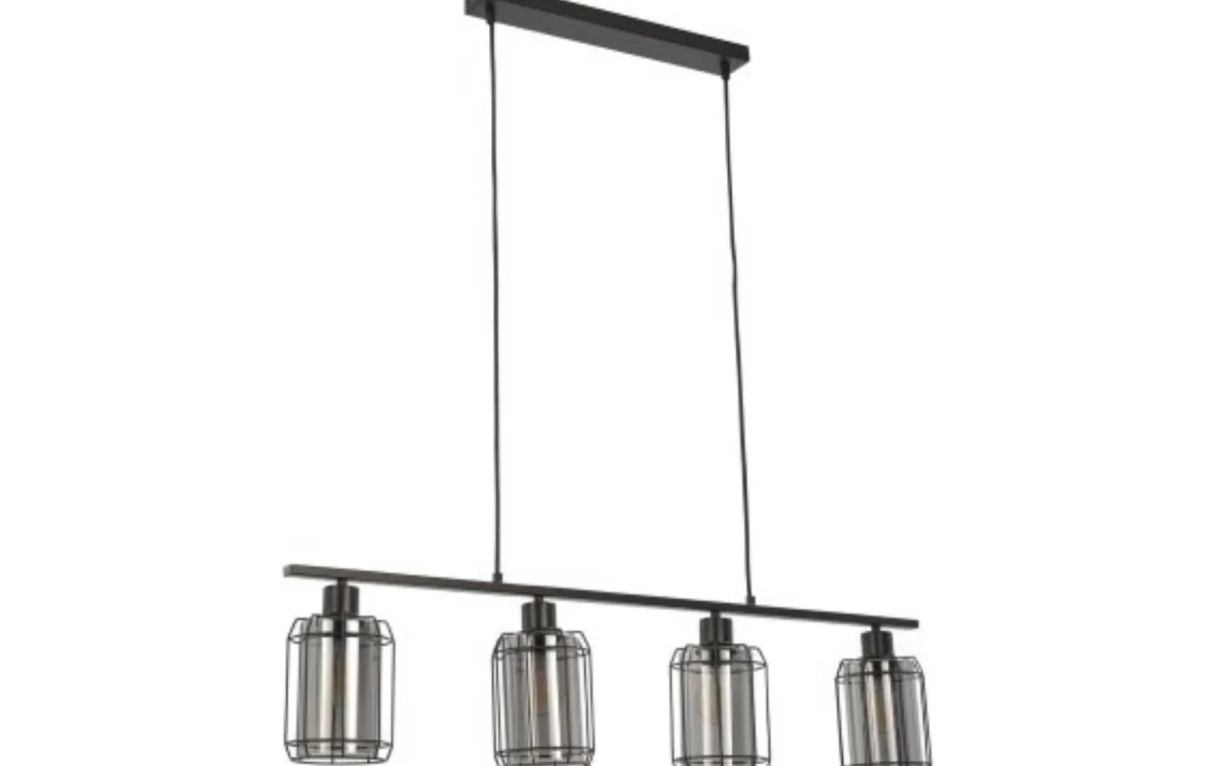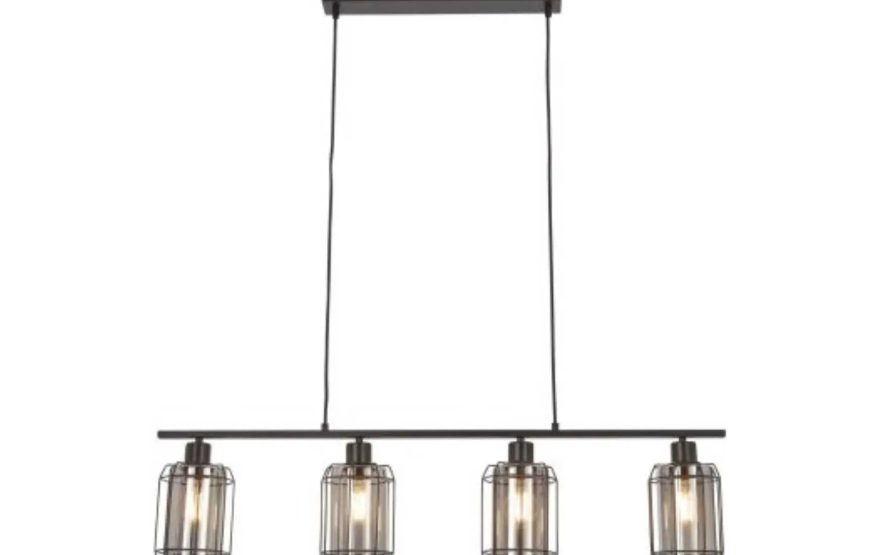 Diese Pendelleuchte verbindet qualitativ hochwertige Materialien mit einem herausragenden Design. Sie bestehen aus robustem Metall in puristischem Schwarz matt, kombiniert mit stabilem, rauchfarbenen Glas. Während die Pendelleuchte mit drei Lampenschirmen ca. 77 x 13 x 120 cm (LxBxH) misst, belaufen sich die Maße der Ausführung mit vier Lampenschirmen auf ca. 98 x 10 x 120 cm (LxBxH). Optisch weisen die Leuchten moderne Merkmale, aber auch Anklänge des angesagten Industriestils auf. Durch diese besondere Mischung setzen sie einen gelungenen Akzent, ob in der Küche, im Wohn- oder im Schlafzimmer. Zur Nutzung der stilvollen Hängeleuchten werden drei bzw. vier Leuchtmittel der Fassung E27 mit einer Leistung von jeweils maximal 60 Watt benötigt. Diese sind nicht im Preis inbegriffen.