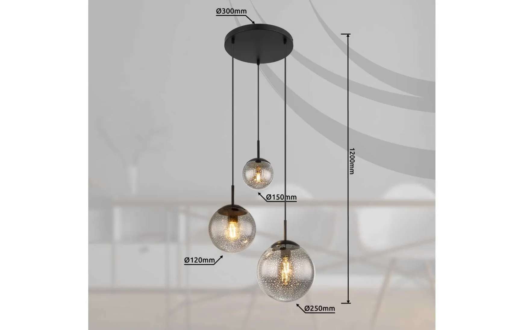 Diese wunderschöne Hängeleuchte begeistert durch ein tolles Design. Aus einer runden Deckenbefestigung verlaufen drei schwarz matte Kabel zu jeweils einer E27 Fassung. Glaskugeln in drei verschiedenen Größen mit Sterneffekt vervollständigen das tolle Gesamtbild. Die E27 Fassungen ermöglichen Ihnen bis zu einer maximalen Leistung von 9 Watt, selbst über Lichtfarbe und Helligkeit zu bestimmen. Aufgrund von Langlebigkeit und Stromersparnis empfehlen wir LED Leuchtmittel.