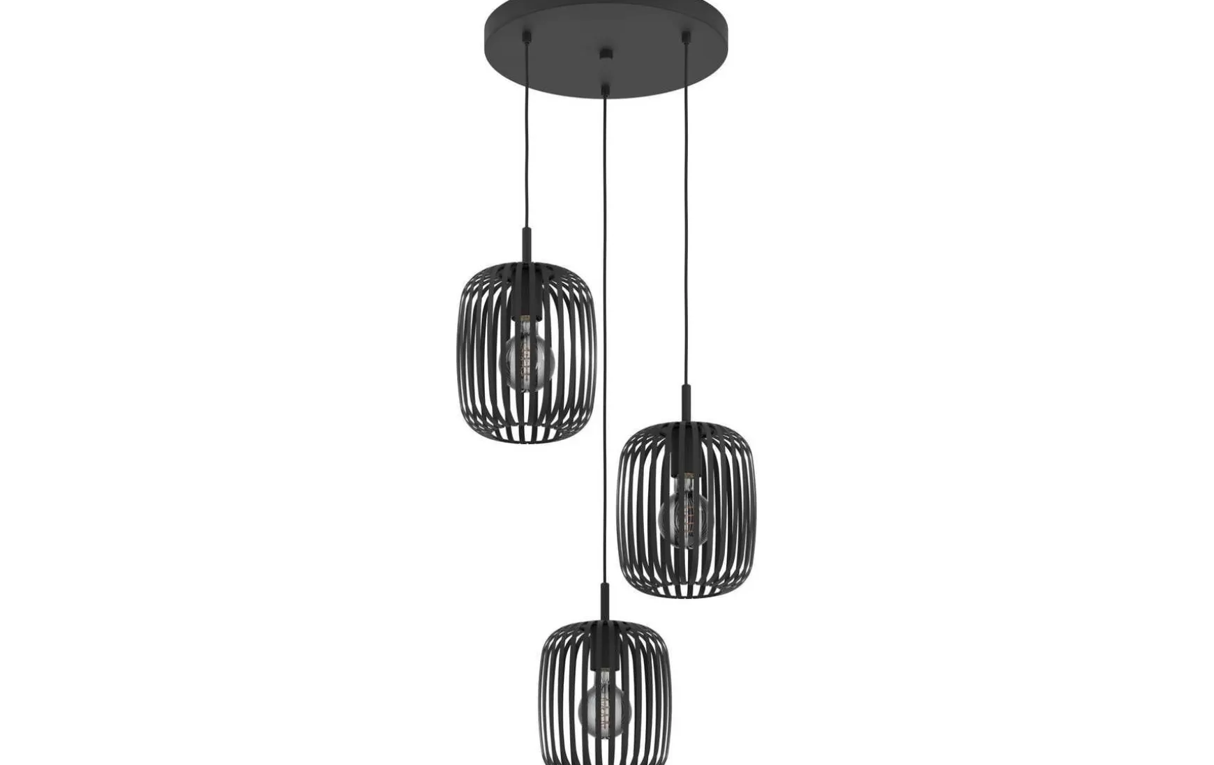 Die Hängeleuchte ist aus drei runden Lampenschirmen aus schwarzen Flachmetallstreifen gefertigt. Die Schirme sind in unterschiedlichen Höhen mittels schwarzer Textilkabel von einem runden Baldachin abgehängt. Durch die Metallbänder entstehen faszinierende Licht- und Schattenspiele, sobald die Leuchte eingeschaltet ist. Die Hängelampe mit ihren soften ballonförmigen Lampenschirmen fügt sich nahtlos in moderne Einrichtungen ein. Sie bietet ein modernes Design für jeden Raum – egal ob in der Küche, im Wohnzimmer oder im Esszimmer über einem Esstisch. Die abgebildeten Filament-Leuchtmittel sind nicht im Lieferumfang enthalten. Geeignet ist die Leuchte für jedes Leuchtmittel mit E27-Sockel.