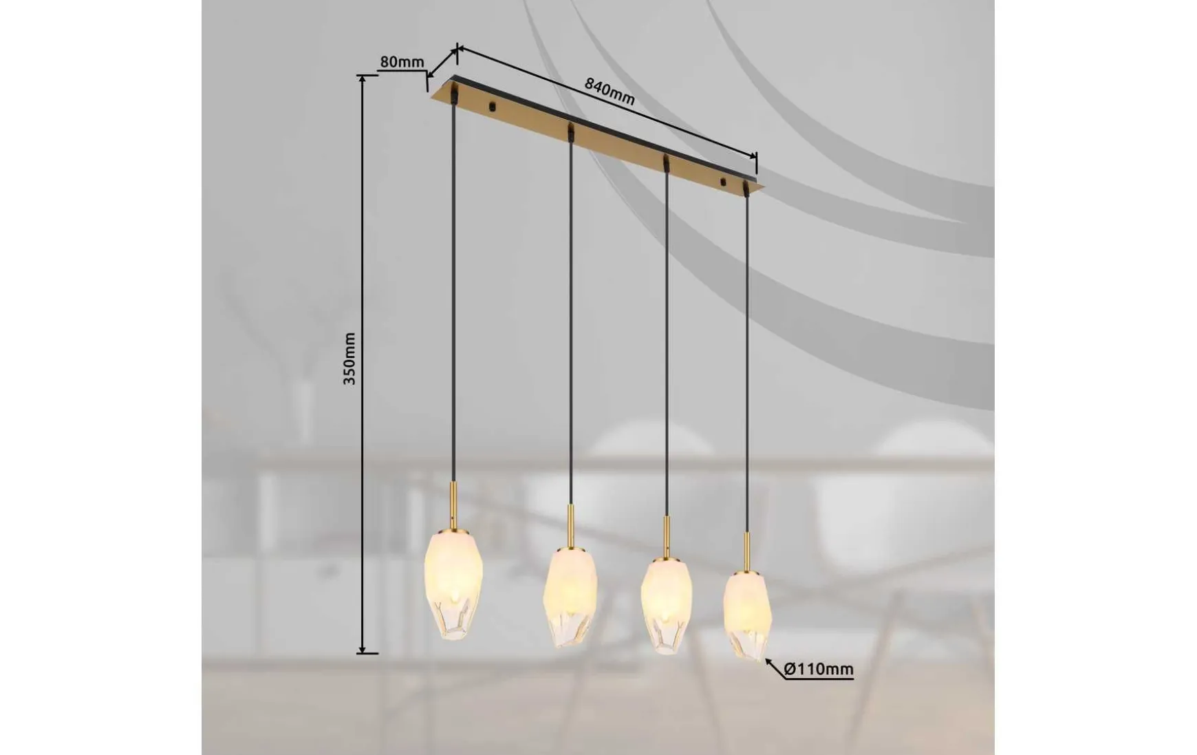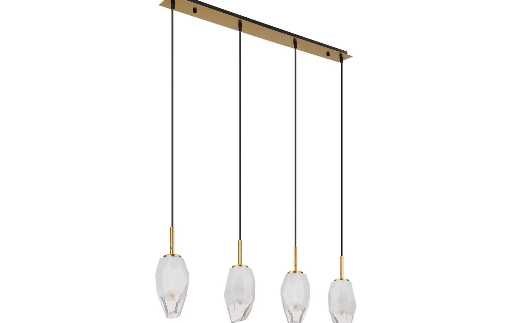 Die Hängeleuchte in messingfarbenem Metall mit opalem und klarem Glas ist eine elegante Wahl für jeden Raum. Das Kabel in PVC Schwarz verleiht der Leuchte einen modernen Touch. Die Leuchte hat eine Größe von 900x110x1200mm und ist somit eine großartige Wahl für mittelgroße Räume. Die Leuchte benötigt 4x E14 LED 7W 230V (nicht inklusive) und sorgt für eine helle und effiziente Beleuchtung. Das opale und klare Glas erzeugt ein und angenehmes Licht. Diese Hängeleuchte ist perfekt für alle, die eine stilvolle und effektive Beleuchtungslösung suchen.