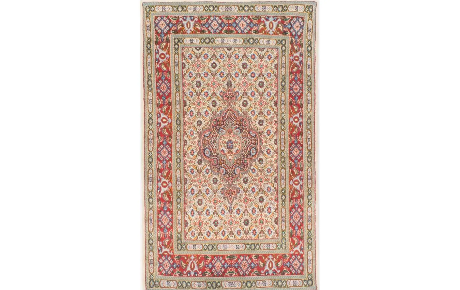Dieser handgeknüpfte Teppich ist ein wahrhaftiges Meisterwerk. Die warmen Beige-, Grüne- und Rottöne in Kombination mit dem traditionellen Mahi-Design verleihen jedem Raum eine zeitlose Eleganz. Der Teppich besteht zu 100% aus hochwertiger Schurwolle und zeichnet sich durch einen besonders dichten Flor aus, was ihm nicht nur eine angenehme Weichheit, sondern auch eine hervorragende Haltbarkeit verleiht. Dieser Teppich wird nicht nur Ihr Zuhause verschönern, sondern auch eine gemütliche Atmosphäre schaffen.