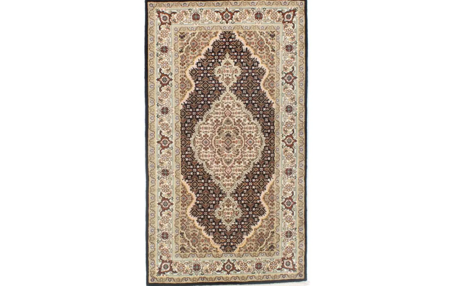 Dieser handgeknüpfte Teppich aus Indien mit traditionellen Mahi Design und sehr feinem Flor aus 100% Schurwolle, passt perfekt in jeden Wohnraum.