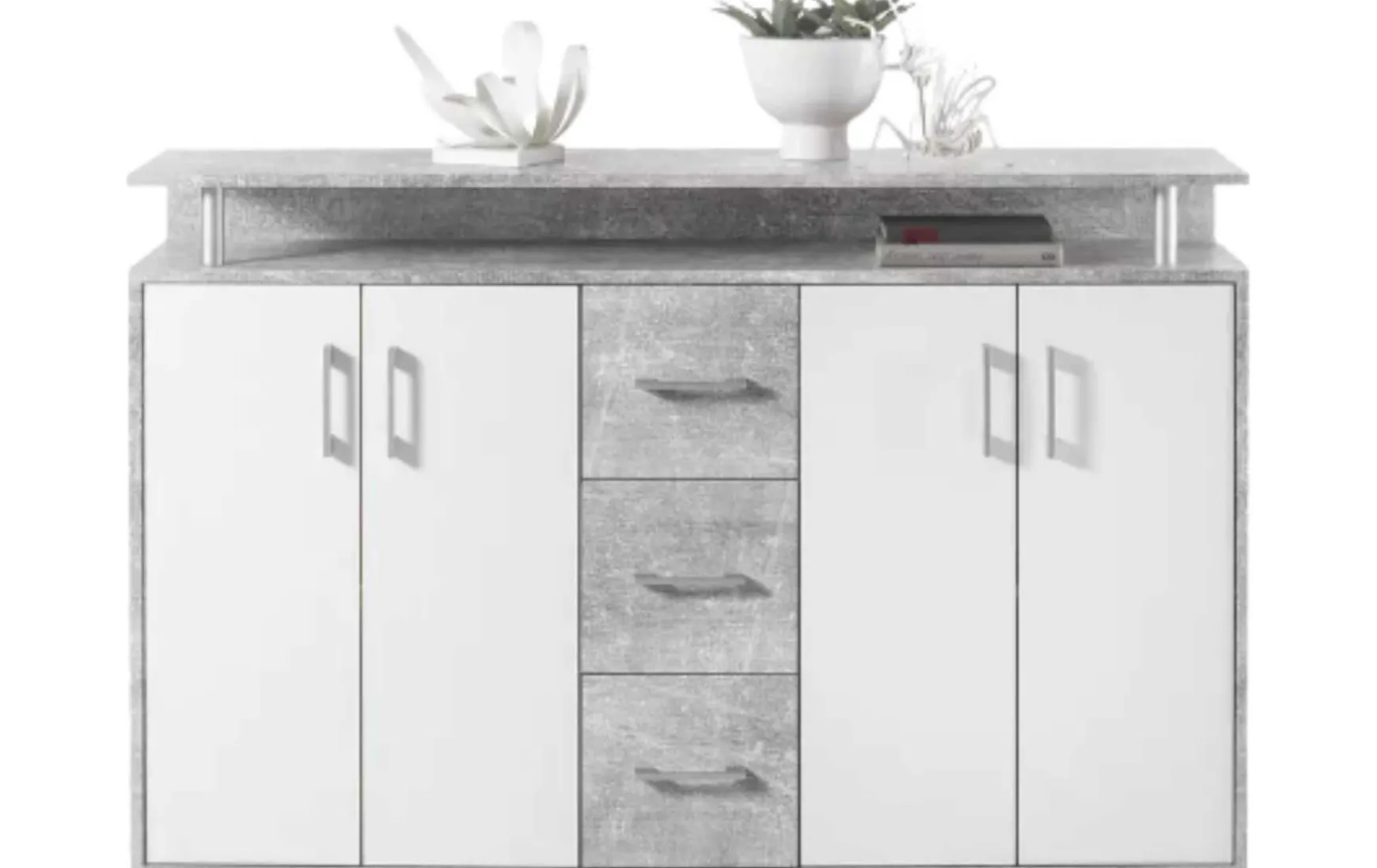 Mit dem Sideboard bringen Sie Ordnung in Ihr Ziimmer. Der Schrank hat vier weiße Drehtüren, hinter denen sich ein Regal und drei Schubladen im Betondekor befinden. Oben ist ein zusätzlicher Einlegeboden angebracht, der den Eindruck erweckt, über dem Schrank zu schweben. Dies verleiht dem Sideboard ein modernes Aussehen und bietet zudem mehr Stauraum.