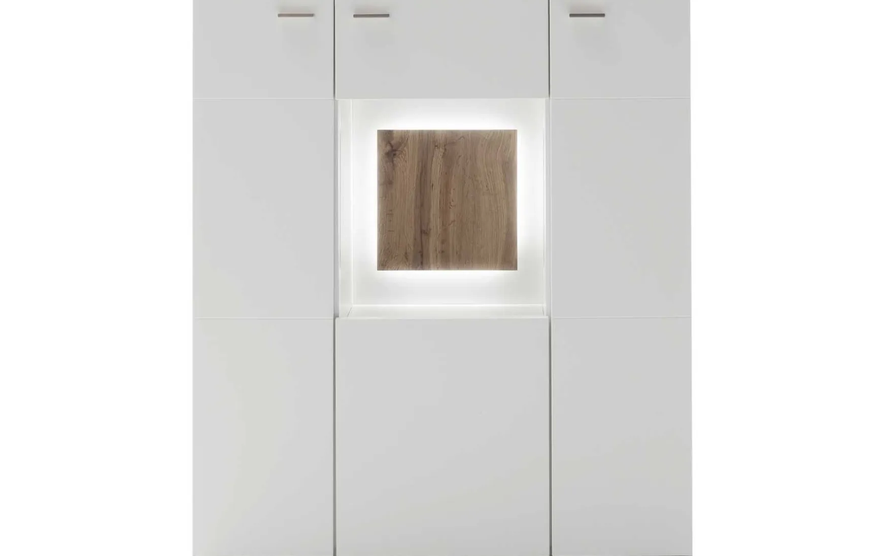 Dieses moderne Highboard in Weiß matt mit Akzenten in Wildeiche Dekor vereint zeitloses Design mit praktischer Funktionalität. Die harmonische Farbkombination verleiht dem Möbelstück eine elegante und zugleich natürliche Ausstrahlung. Hinter den zwei geschlossenen Türen sowie der Glastür bietet das Highboard vielseitigen Stauraum für Geschirr, Gläser oder Wohnaccessoires. Die integrierte Beleuchtung setzt dekorative Highlights und rückt Ihre Lieblingsstücke stilvoll in Szene – ideal für Wohn- oder Essbereich.