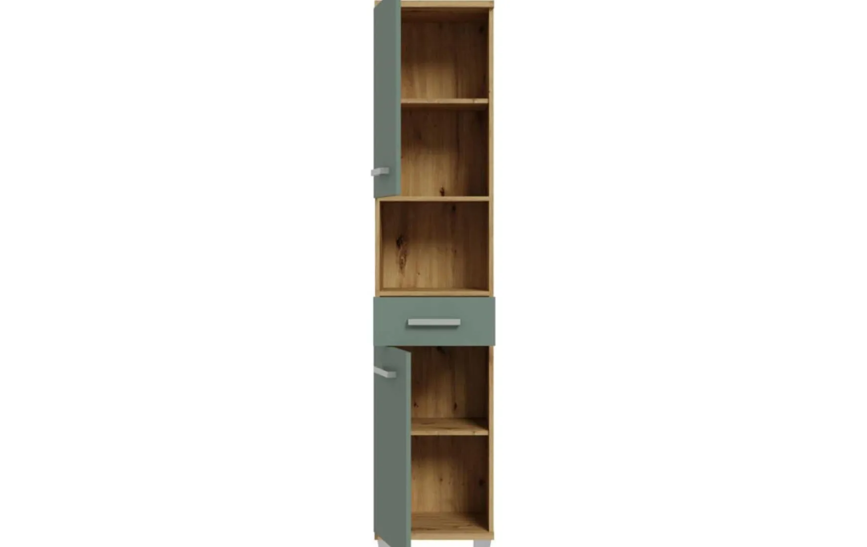 Die moderne Farbkombination aus Salbeigrün und Artisan Eiche verleiht dem Hochschrank eine natürliche, wohnliche Ausstrahlung und wird durch silberfarbene Griffe und Füße harmonisch ergänzt. Gefertigt aus robuster Spanplatte mit pflegeleichter Oberfläche, lässt sich das Möbel einfach trocken abwischen. Mit Maßen von ca. 40 x 35 x 186 cm (B/T/H) bietet der Hochschrank viel Stauraum bei schlanker Form. Die Lieferung erfolgt zerlegt.