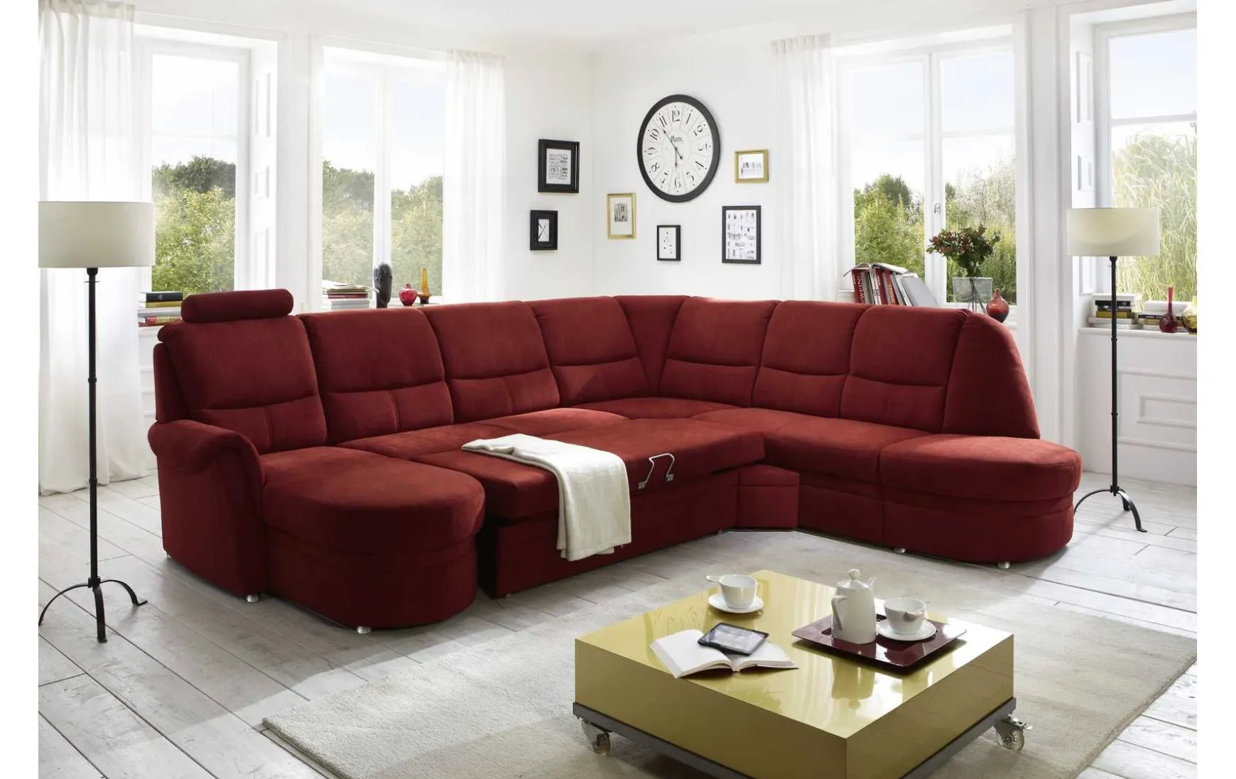 Diese klassische Wohnlandschaft in U-Form überzeugt durch zeitloses Design und hohen Sitzkomfort. Der bordeauxrote Stoffbezug verleiht dem Möbelstück eine elegante Ausstrahlung, während silberfarbige Metallfüße einen modernen Akzent setzen. Mit einer großzügigen Gesamtbreite von ca. 320 cm und einer Länge von ca. 277 cm bietet sie viel Platz zum Entspannen. Der Sitz ist mit einem hochwertigen Super-Bonell-Federkern auf Wellenfedern ausgestattet und sorgt gemeinsam mit Polyätherschaum für angenehmen Komfort, ergänzt durch eine Sitzhöhe von ca. 45 cm. Die Rückenlehne besteht aus hochelastischen Polstergurten mit hochwertigem Schaum. Das stabile Gestell aus Hartholz und Holzwerkstoffen garantiert Langlebigkeit. Optional sind gegen Mehrpreis Funktionen wie Bettfunktion, Relaxfunktion, Stauraum, Boxspring im Sitz oder Kopfstützen erhältlich. Farbenalternativen stehen ebenfalls zur Auswahl.