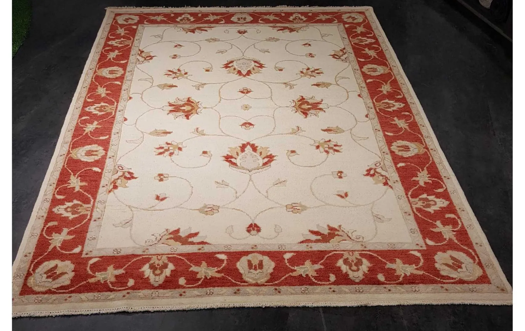 Handgeknüpfter Teppich aus Indien mit großflächigem Floralmuster und Flor aus 100% Schurwolle.