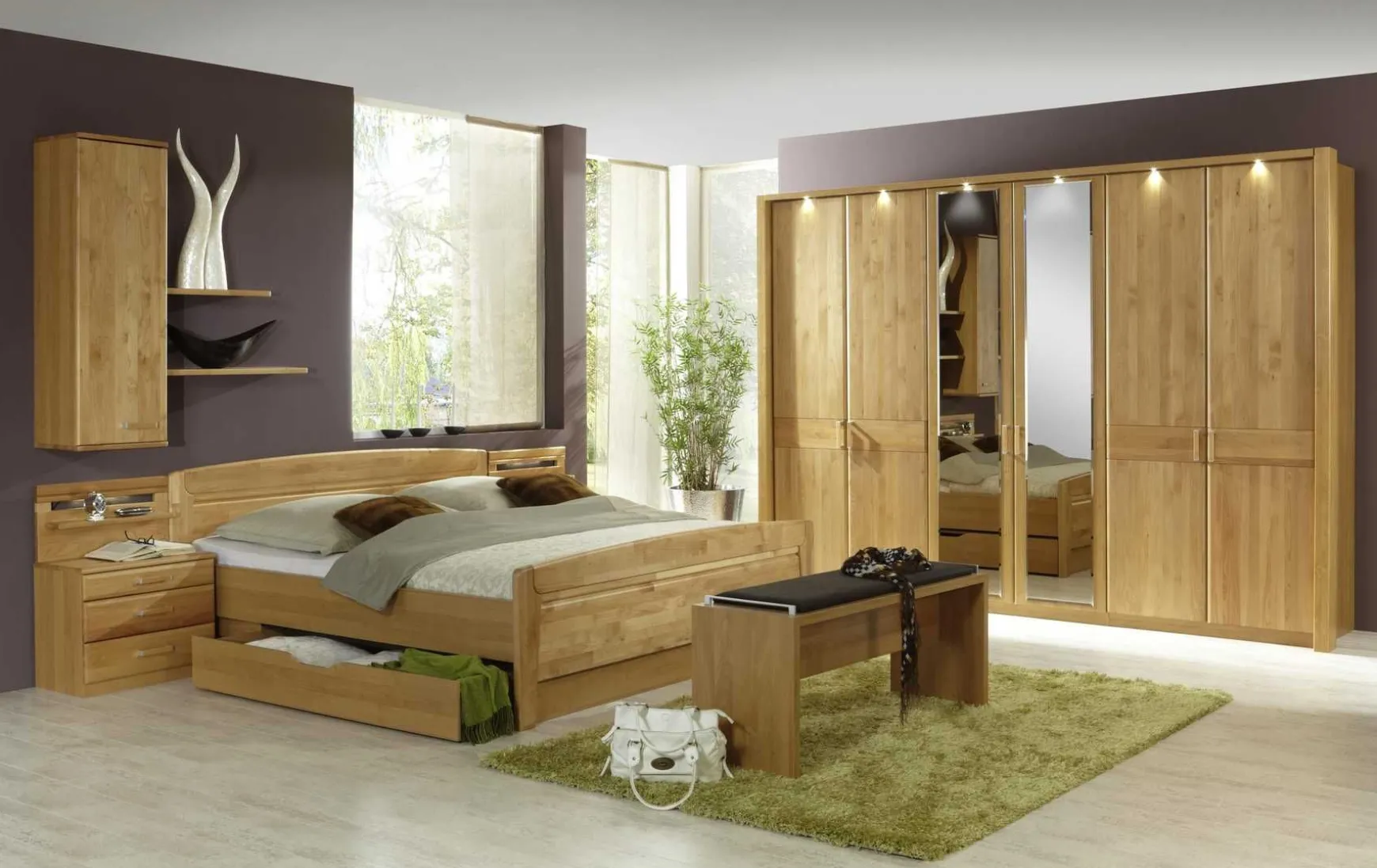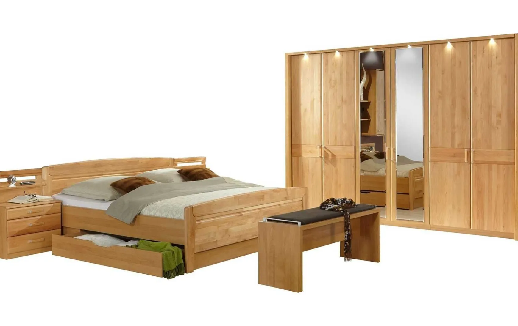 Mit diesem Schlafzimmer richten Sie mühelos einen perfekt aufeinander abgestimmten Schlafraum ein. Das Ensemble besteht aus einem großzügigen Drehtürenschrank mit sechs Drehtüren, einem Komfortbett mit einer Liegefläche von 180 x 200 cm und einem Set Nachtkonsolen. Alle Elemente verbindet die schöne Erlen-Optik mit einer gleichmäßigen Maserung. Die Fronten, bestehend aus Erle, werten das Design weiter auf. Der Schrank ist zudem mit zwei Spiegeltüren ausgestattet. Diese sorgen nicht nur für eine moderne Note, sie eignen sich auch als praktischer Ganzkörperspiegel. 6 Fachböden, sowie 3 Kleiderstangen bieten Ihnen jede menge Möglichkeiten zum Aufhängen und Ordnen.