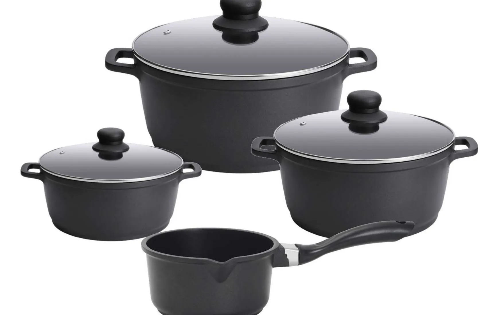 Set bestehend aus einer Kasserolle (Ø: 16 cm, Volumen 1,5 Liter), drei Kochtöpfen mit Deckel (Ø: 16 cm, Volumen 1,5 Liter) (Ø: 20 cm, Volumen 2,5 Liter) und (Ø: 24 cm, Volumen 5 Liter)