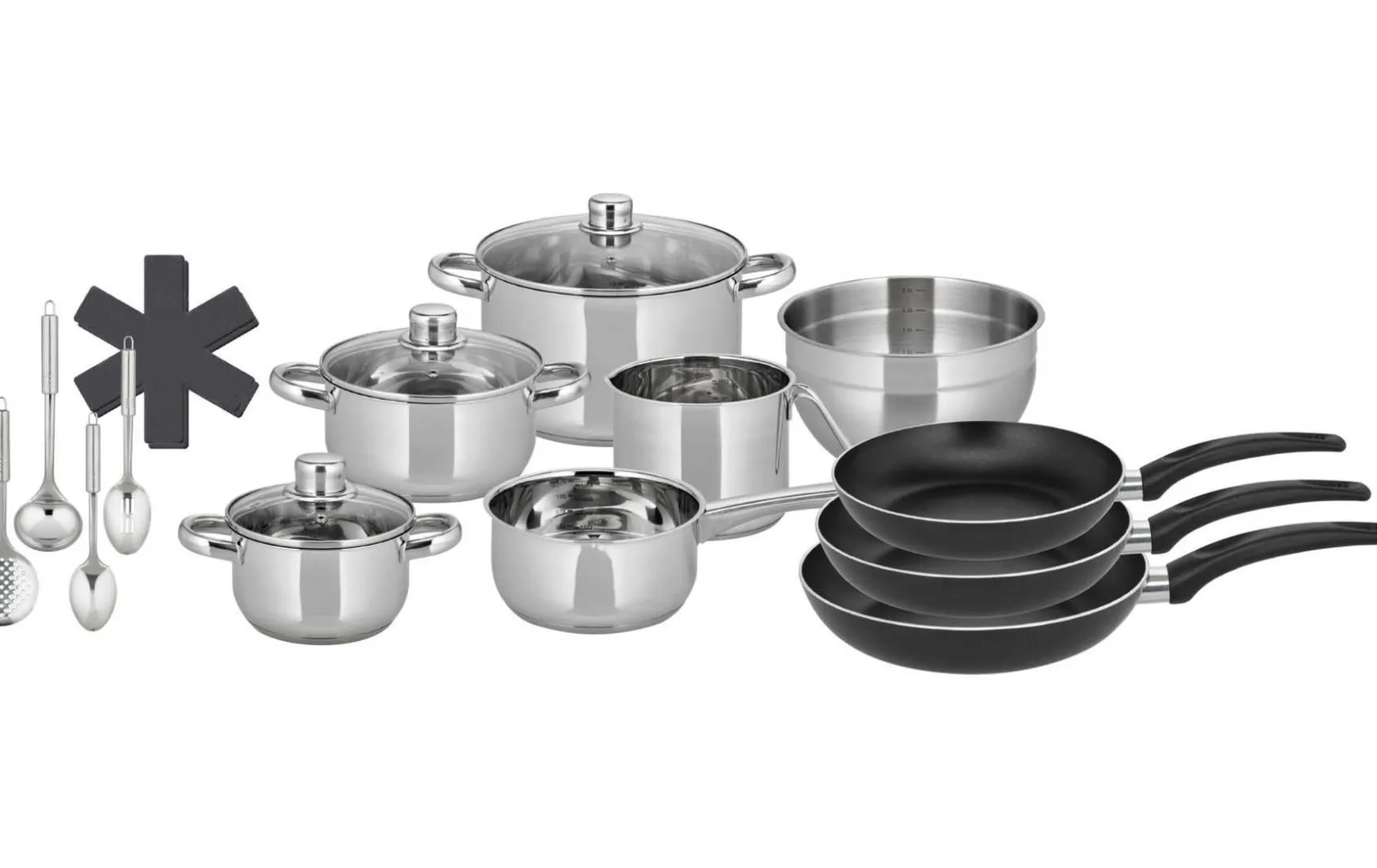 Das 15-teilige Starter-Topfset bietet Ihnen eine perfekt abgestimmte Grundausstattung für jede Küche. Hochwertige Töpfe aus Edelstahl 18/8–18/10 mit praktischer Volumenskala treffen auf antihaftbeschichtete Aluminium-Pfannen für komfortables und fettarmes Braten. Glasdeckel mit Edelstahlrand, ergonomische Griffe sowie vielseitiges Zubehör wie Pfannenschoner und Küchenhelfer machen dieses Set zum idealen Begleiter für Einsteiger und ambitionierte Hobbyköche. Geeignet für alle Herdarten – inklusive Induktion – überzeugt das Set durch Funktionalität, Langlebigkeit und modernes Design.