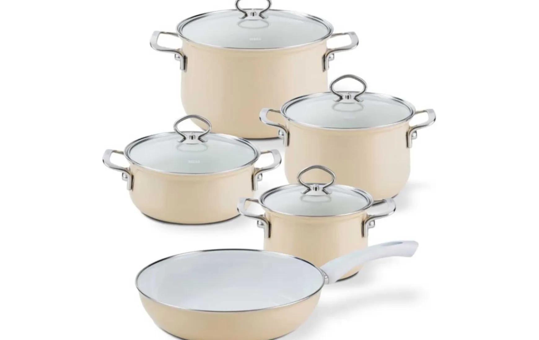 Alle Kochtöpfe sind mit starkem Boden, rostfreier Schüttrand, Edelstahlgriffe und Glasdeckel ausgestattet.