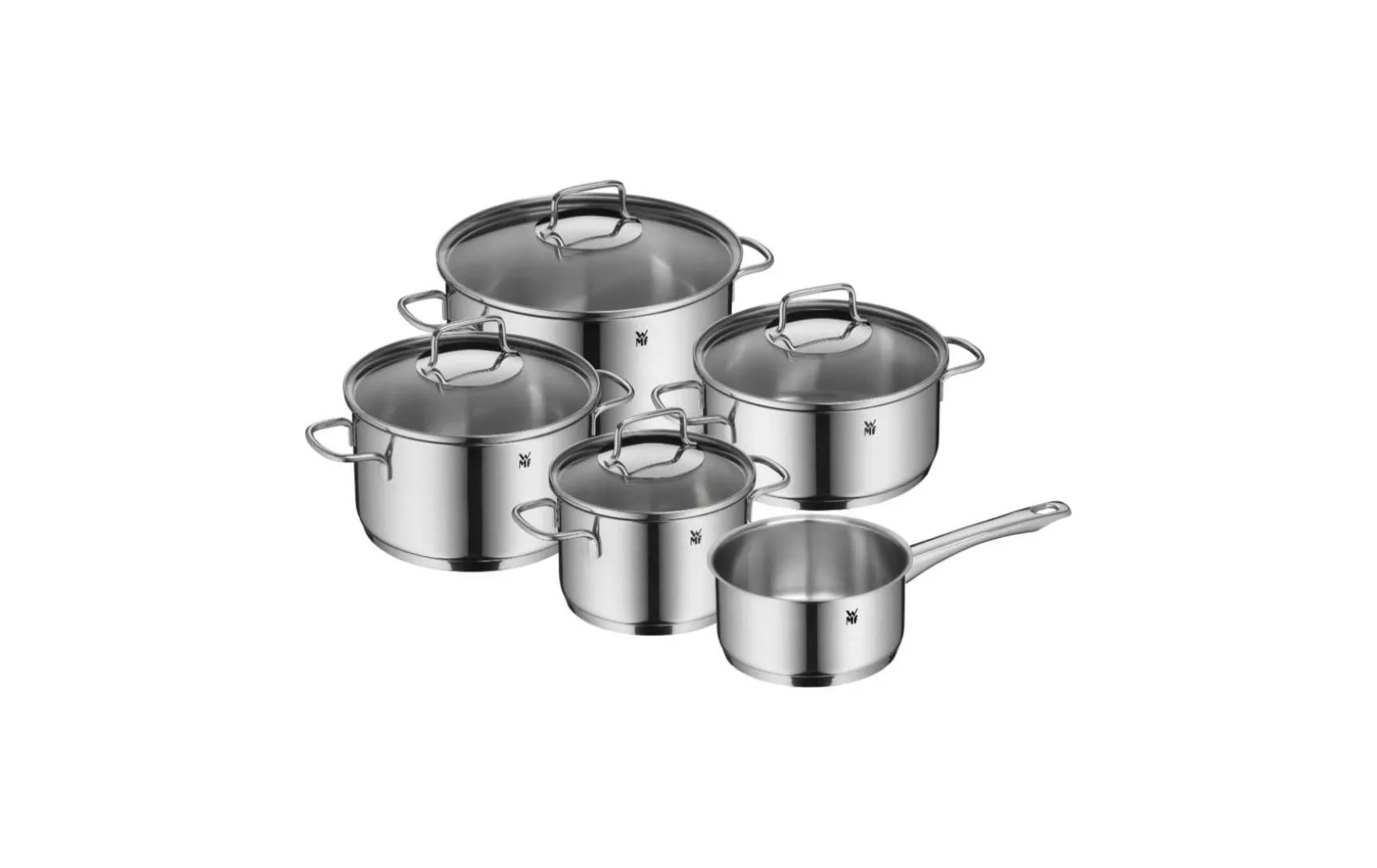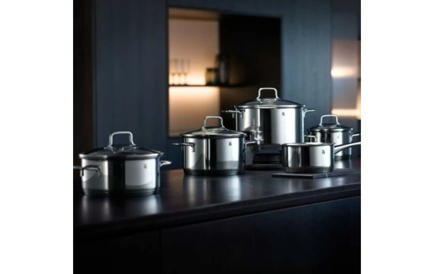 Raffinierte und markante Linien, hochglanzpolierte Oberflächen und viele sinnvolle Ausstattungsdetails: Dieses Kochgeschirr von WMF weiß in jeder Küche und – dank des TransTherm®-Allherdbodens auch auf jedem Herd, einschließlich Induktion zu überzeugen. Dieser ermöglicht dank optimaler Wärmeverteilung und -speicherung besonders energiesparendes Kochen mit dem 5-teiligen Topf-Set. Und damit nicht genug. Alle Teile sind dazu mit einem breiten Schüttrand für mühelos-tropffreies Ausgießen von Flüssigkeiten versehen, während dank des hochwertigen Glasdeckels der Kochvorgang jederzeit problemlos überwacht werden kann. Gefertigt aus genauso elegantem wie strapazierfähigem und pflegeleichtem Cromargan®: Edelstahl Rostfrei 18/10 und hochwertigem Glas, dürfen alle Teile selbstverständlich zur komfortablen Reinigung in die Spülmaschine.