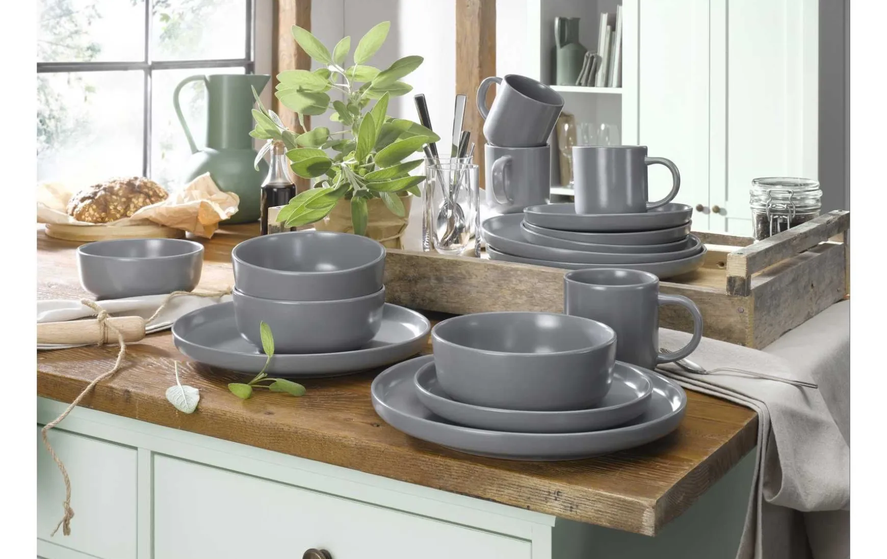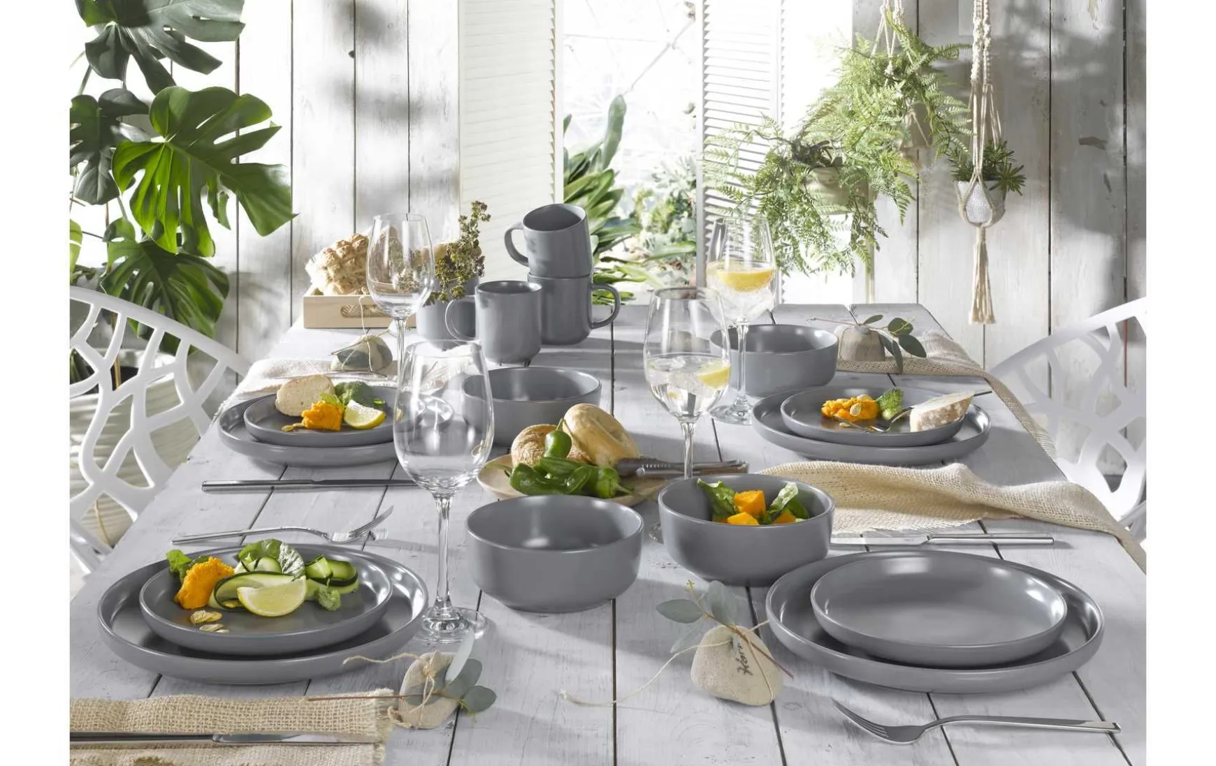 Diese alltagstaugliche Zusammenstellung aus je 4 Speise- und Desserttellern, Schalen und Kaffeebechern, in elegantem nordischem Design ist Geschirrspül- und mikrowellengeeignet.