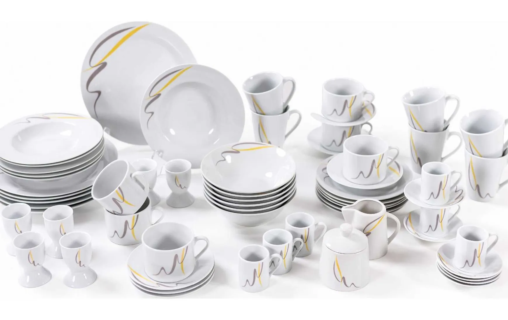 - Im Preis enthalten: Artikelinhalt: 6x Speiseteller, 6x Suppenteller, 6x Frühstücksteller, 6x Müslischalen, 6x Kaffeebecher, 6x Kaffeeuntertassen, 6x Kaffeeobertassen, 6x Espressountertassen, 6x Espressoobertassen, 1x Milchkännchen, 1x Zuckerdose, 6x Eierbecher