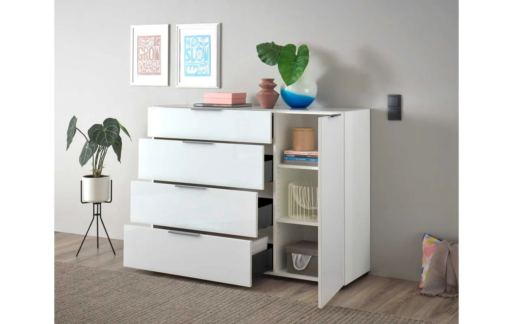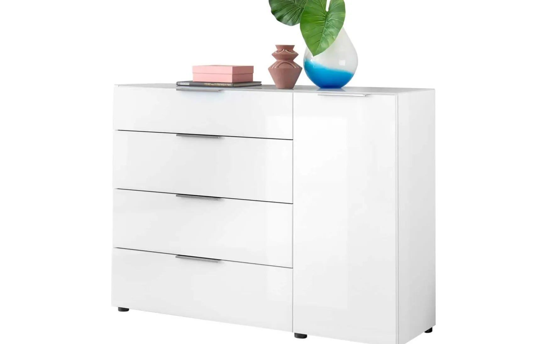 Die großzügige Kommode misst ca. 135 × 99 × 40 cm und überzeugt mit 1 Tür und 4 Schubkästen. Hinter der Tür findest du 2 Einlegeböden, die flexibel genutzt werden können, während die Schubkästen reichlich Platz für Kleidung, Unterlagen oder Accessoires schaffen. Dank der Glasfronten wirkt sie modern und elegant. Besonders attraktiv: Trotz Glasfronten bleibt die Kommode preislich unschlagbar.