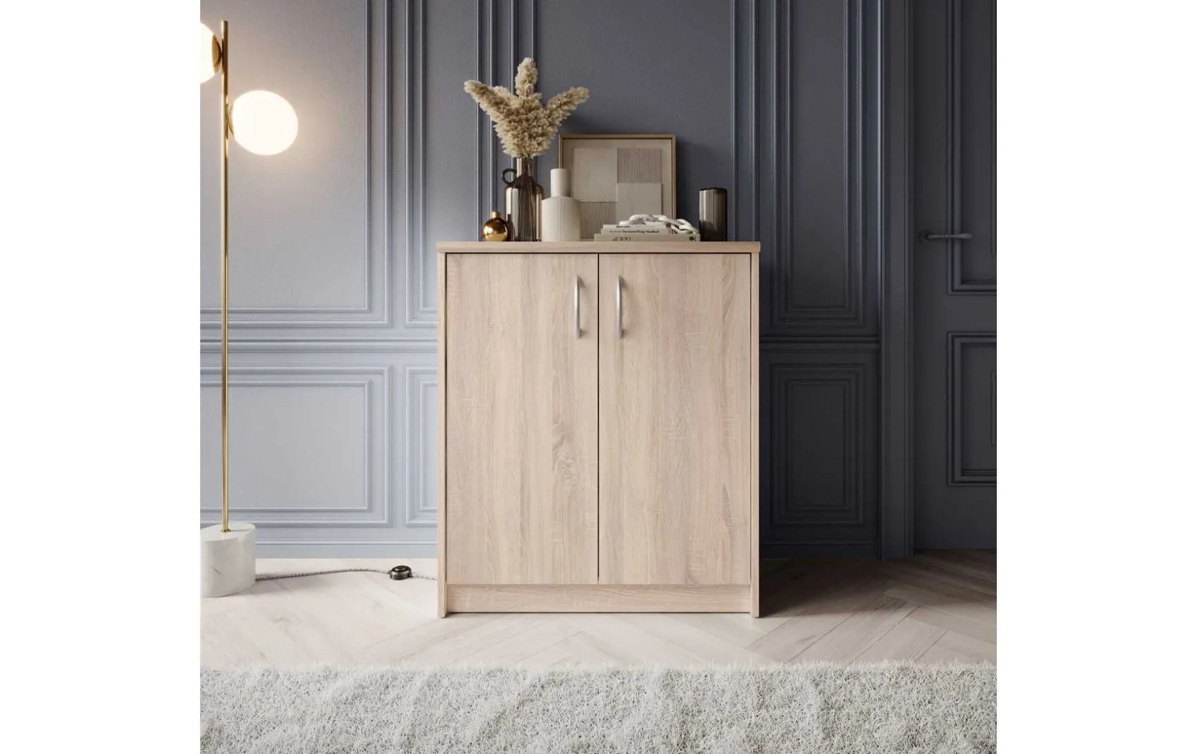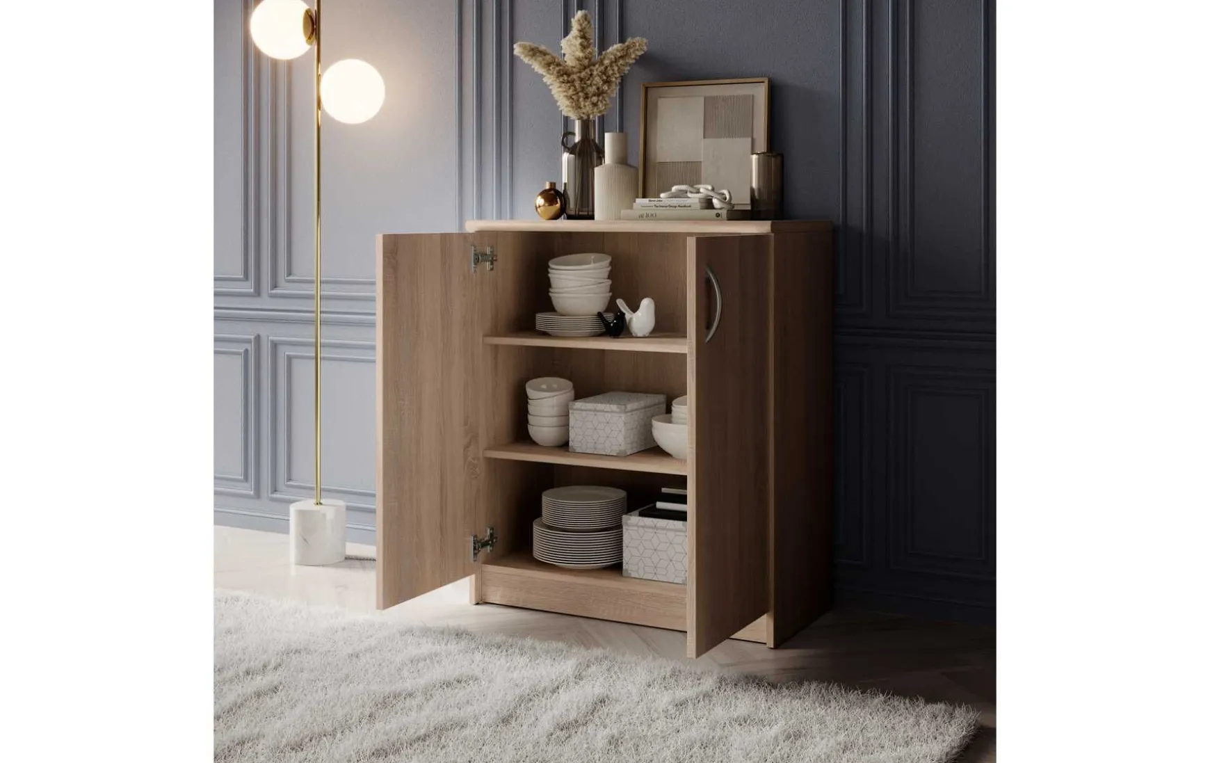 Mit ihrem schlichten aber zeitlos elegantem Design mit Dekor in Eiche Sonoma fügt sich diese Kommode in jeden Wohnraum hervorragend ein. Hinter der Doppeltür verbirgt sich ein großer Stauraum, der durch 2 höhenverstellbare Einlegeböden unterteilt wird.