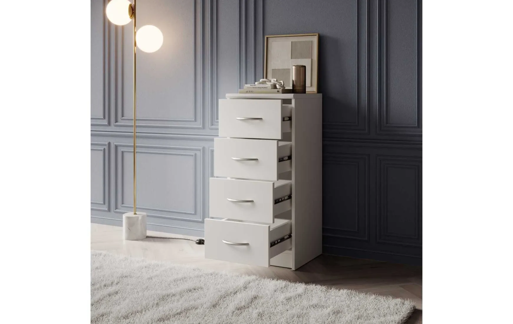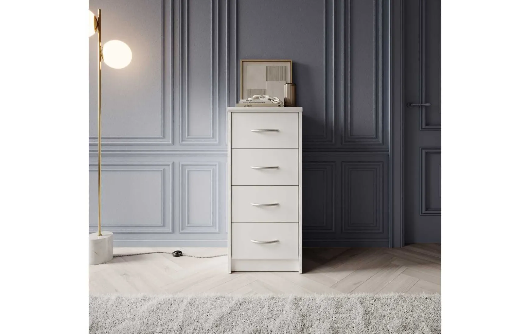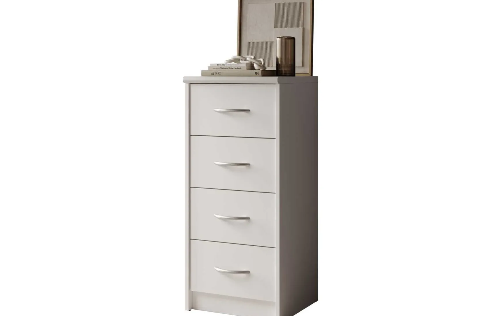 Mit ihrem schlichten aber zeitlos elegantem Design mit Dekor in Weiß fügt sich diese Kommode in jeden Wohnraum hervorragend ein. In den 4 Schubladen ist trotz der geringen Stellfläche reichlich Stauraum für allerlei Utensilien.