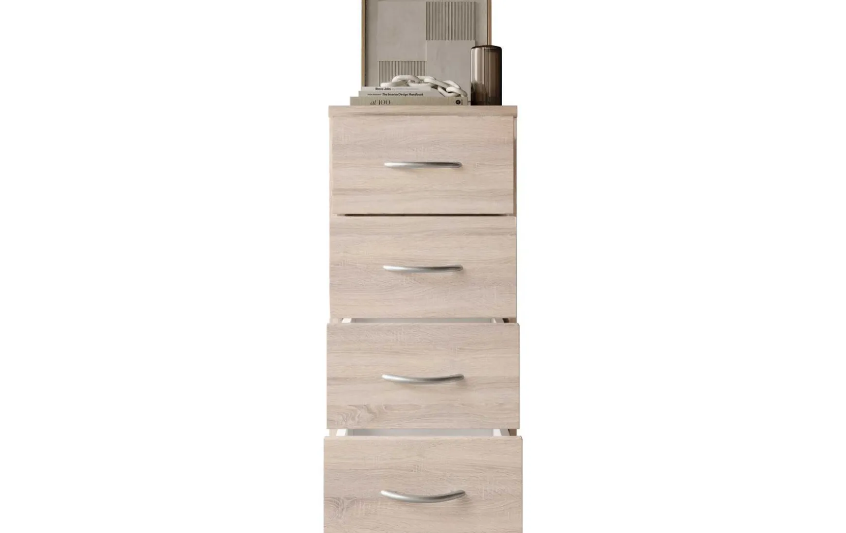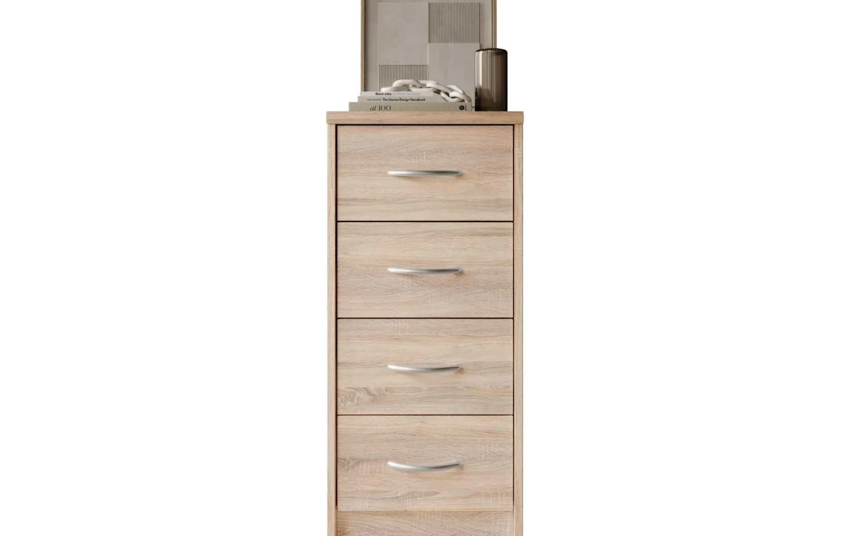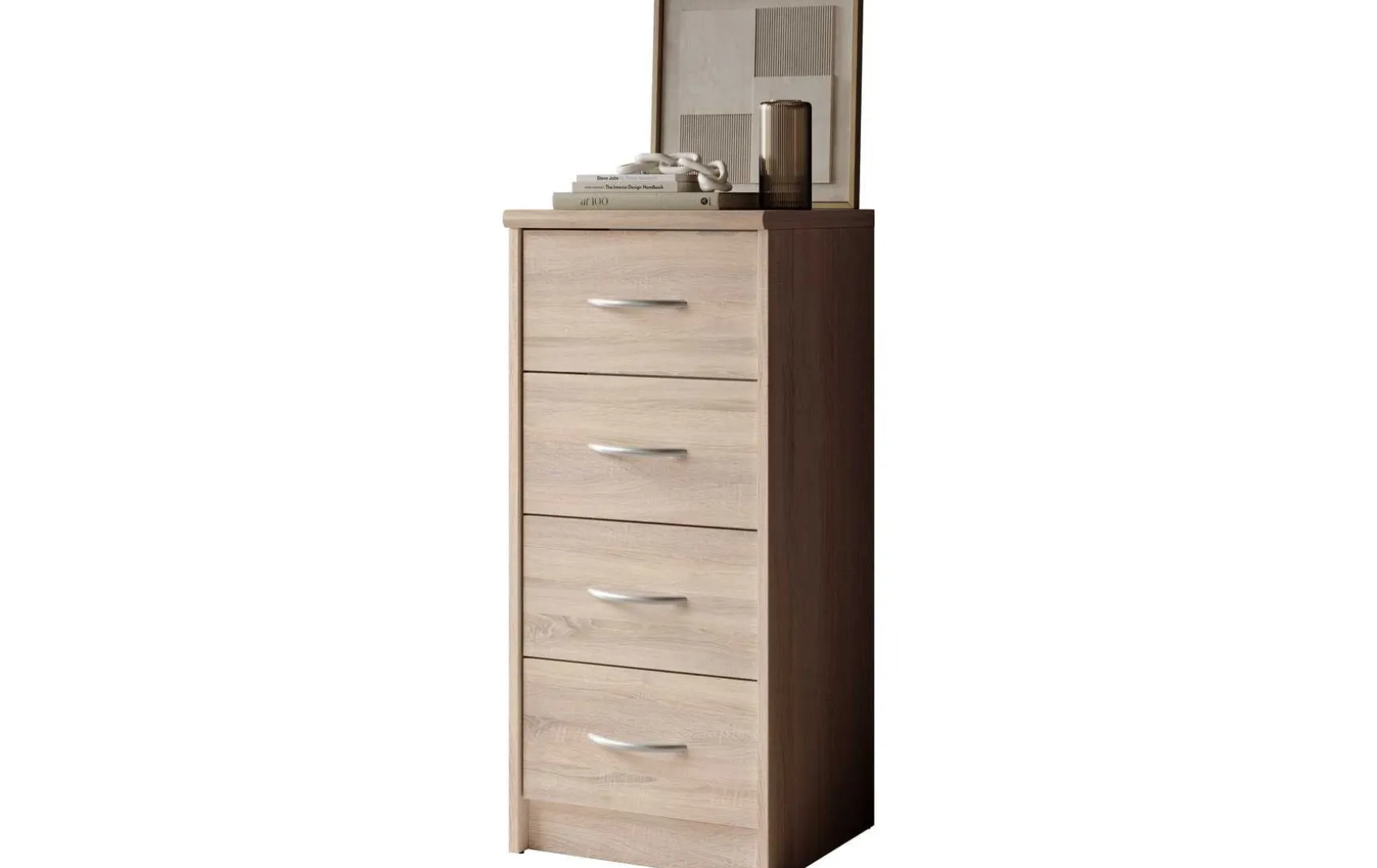 Mit ihrem schlichten aber zeitlos elegantem Design mit Dekor in Eiche Sonoma fügt sich diese Kommode in jeden Wohnraum hervorragend ein. In den 4 Schubladen ist trotz der geringen Stellfläche reichlich Stauraum für allerlei Utensilien.