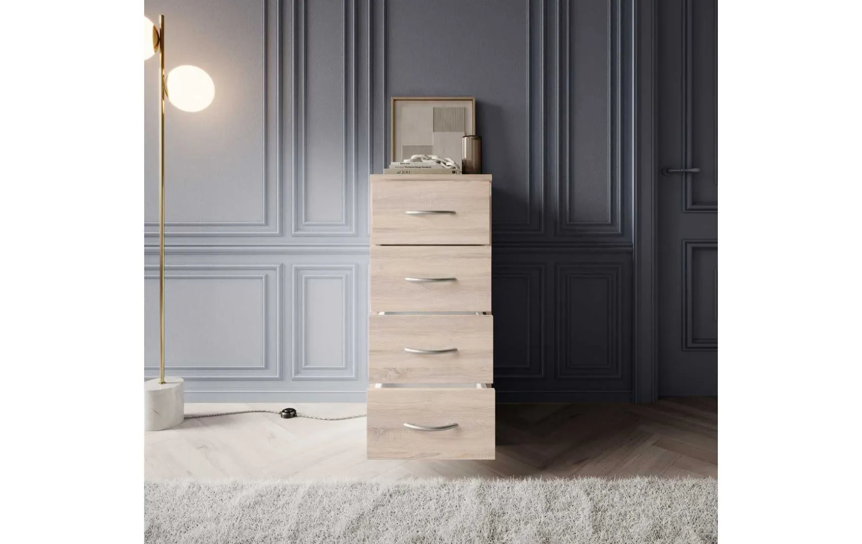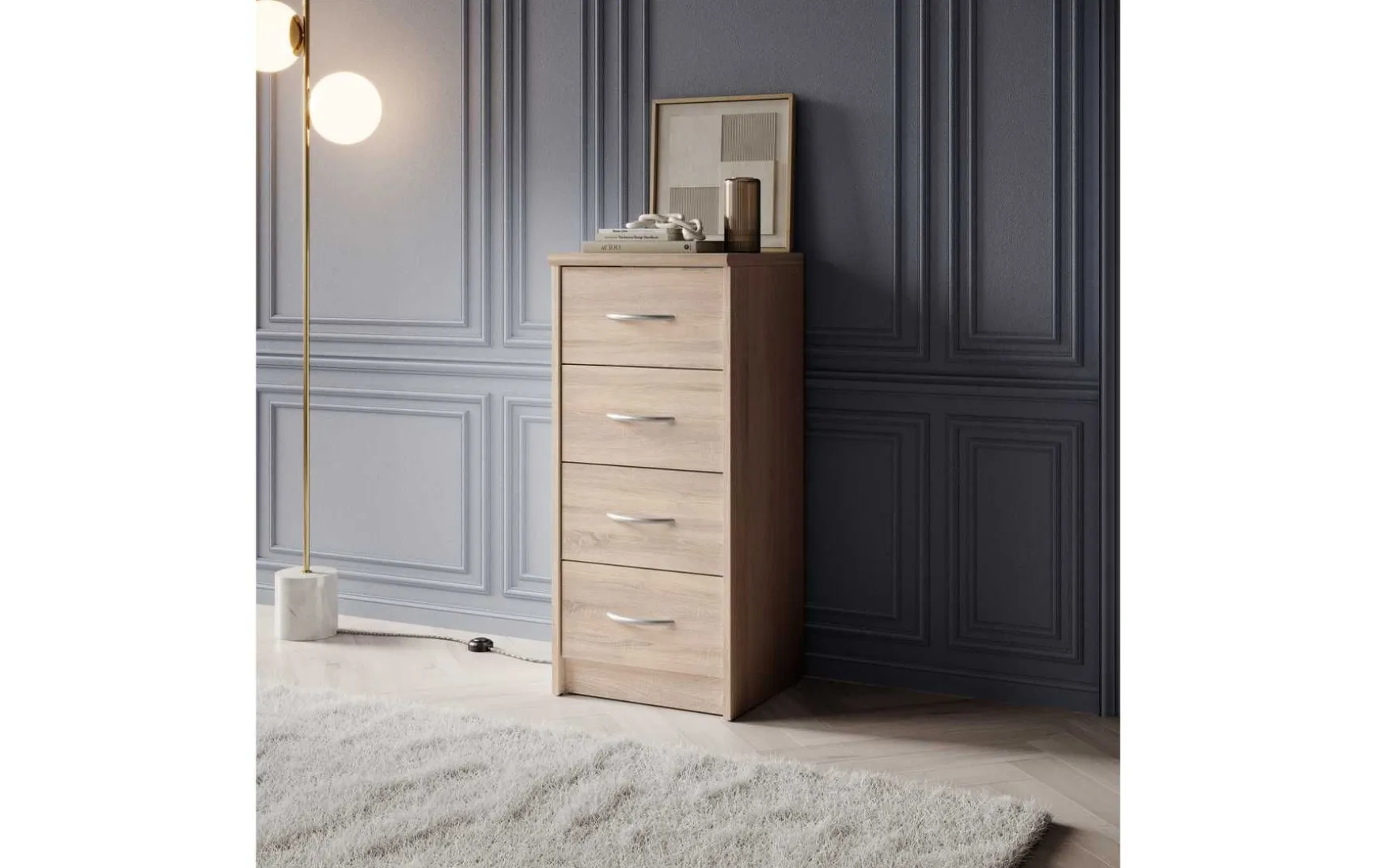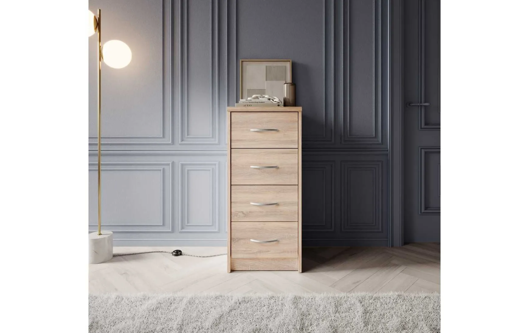 Mit ihrem schlichten aber zeitlos elegantem Design mit Dekor in Eiche Sonoma fügt sich diese Kommode in jeden Wohnraum hervorragend ein. In den 4 Schubladen ist trotz der geringen Stellfläche reichlich Stauraum für allerlei Utensilien.