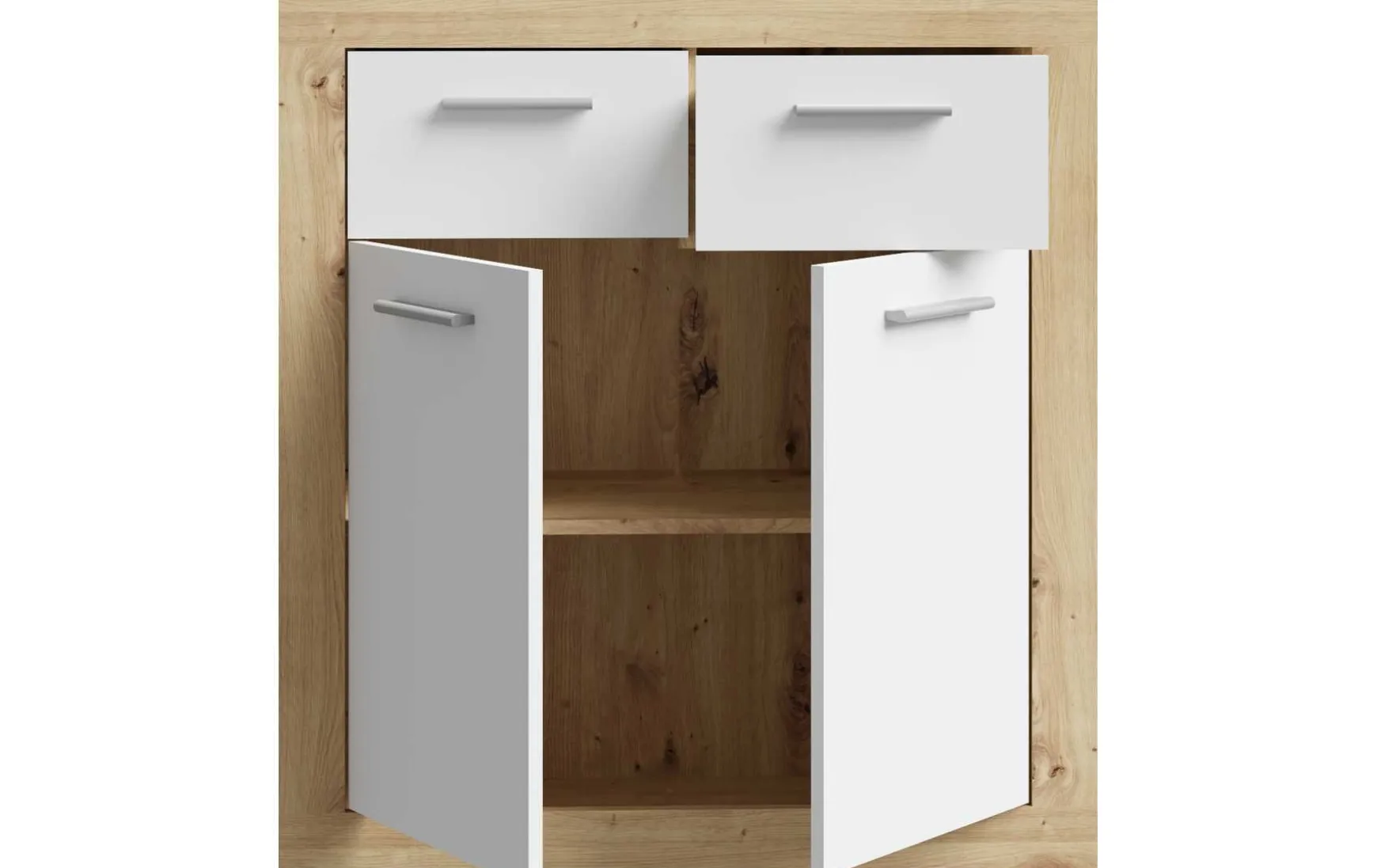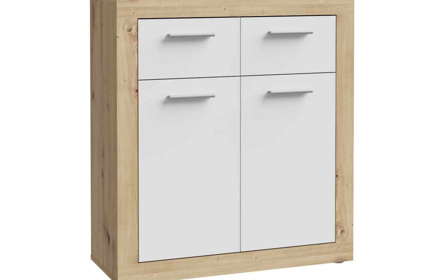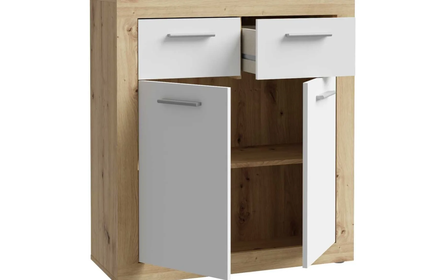 Die Kommode überzeugt durch ihr kompaktes Design und durchdachte Aufteilung. Mit zwei Türen, zwei Schubkästen und einem Einlegeboden bietet sie praktischen Stauraum für Wohn-, Ess- oder Flurbereich.