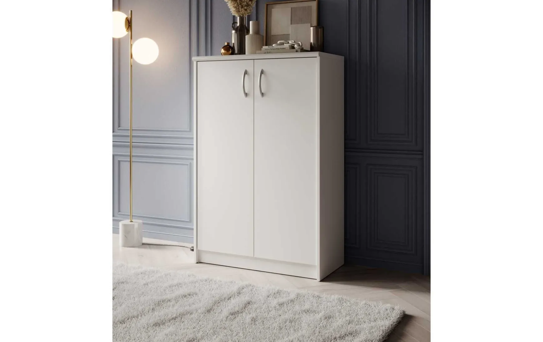 Mit ihrem schlichten aber zeitlos elegantem Design mit Dekor in Weiß fügt sich diese Kommode in jeden Wohnraum hervorragend ein. Hinter der Doppeltür verbirgt sich ein großer Stauraum, der durch 3 höhenverstellbare Einlegeböden unterteilt wird.