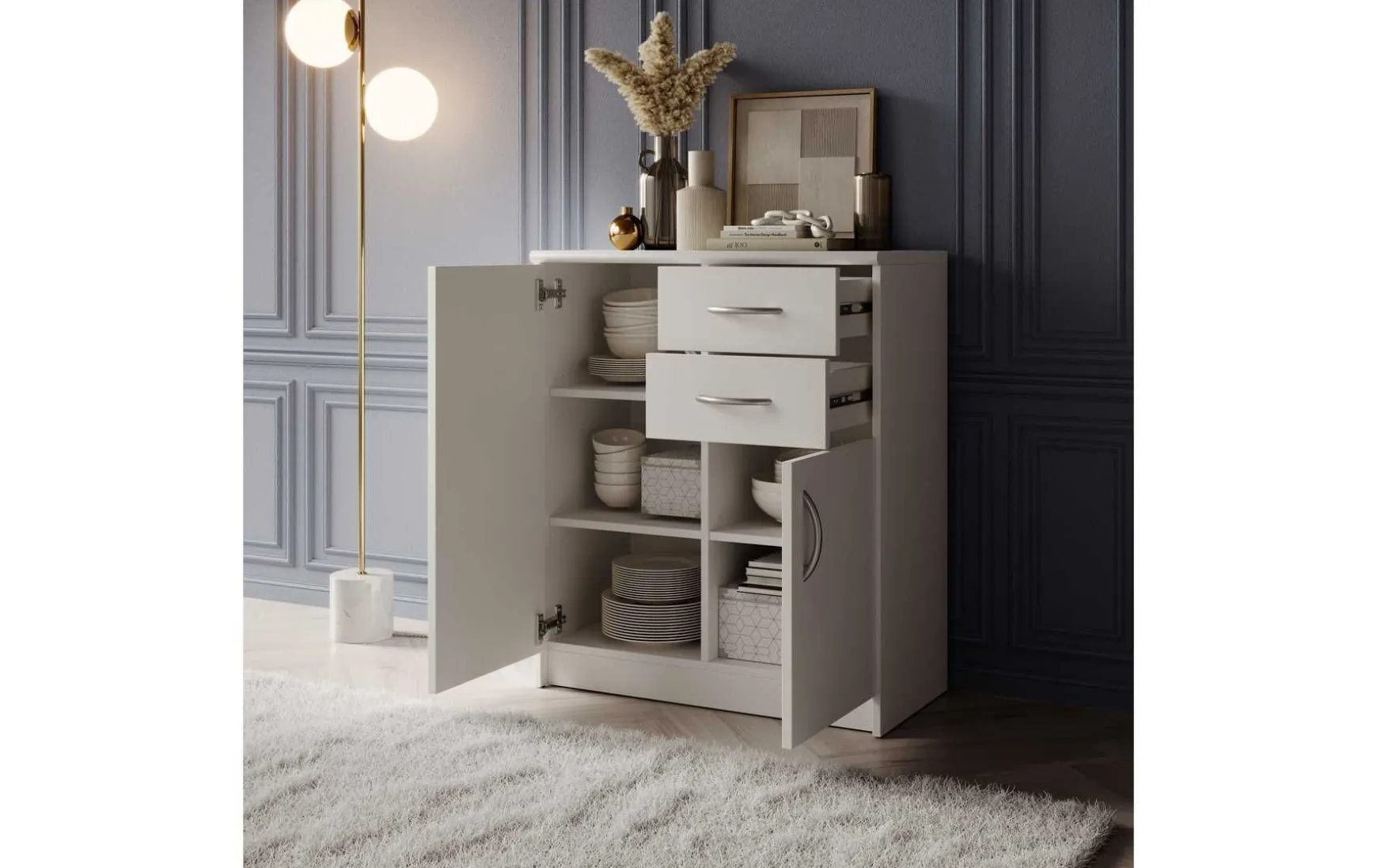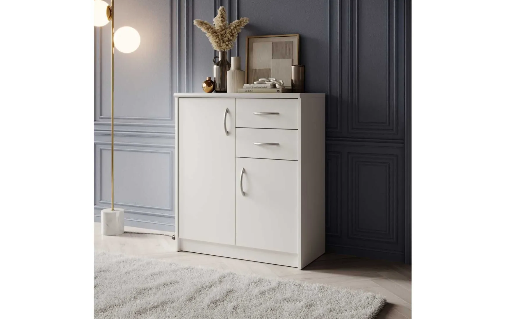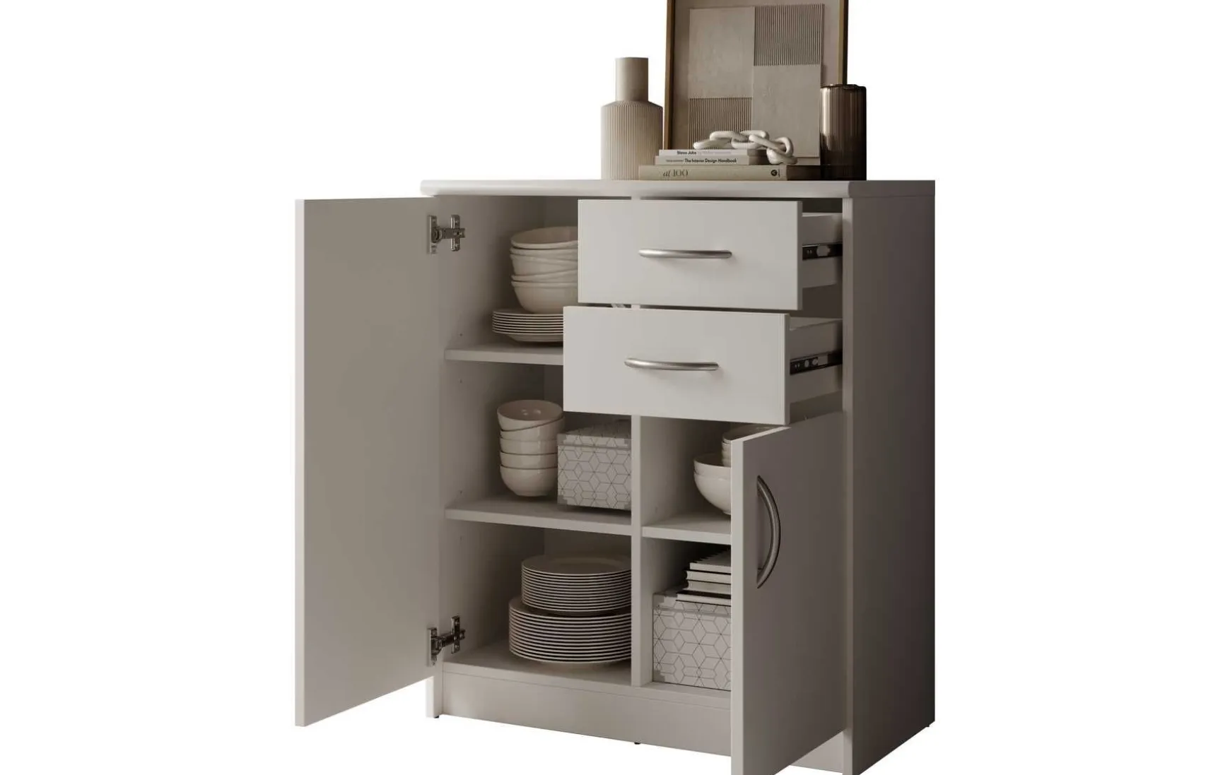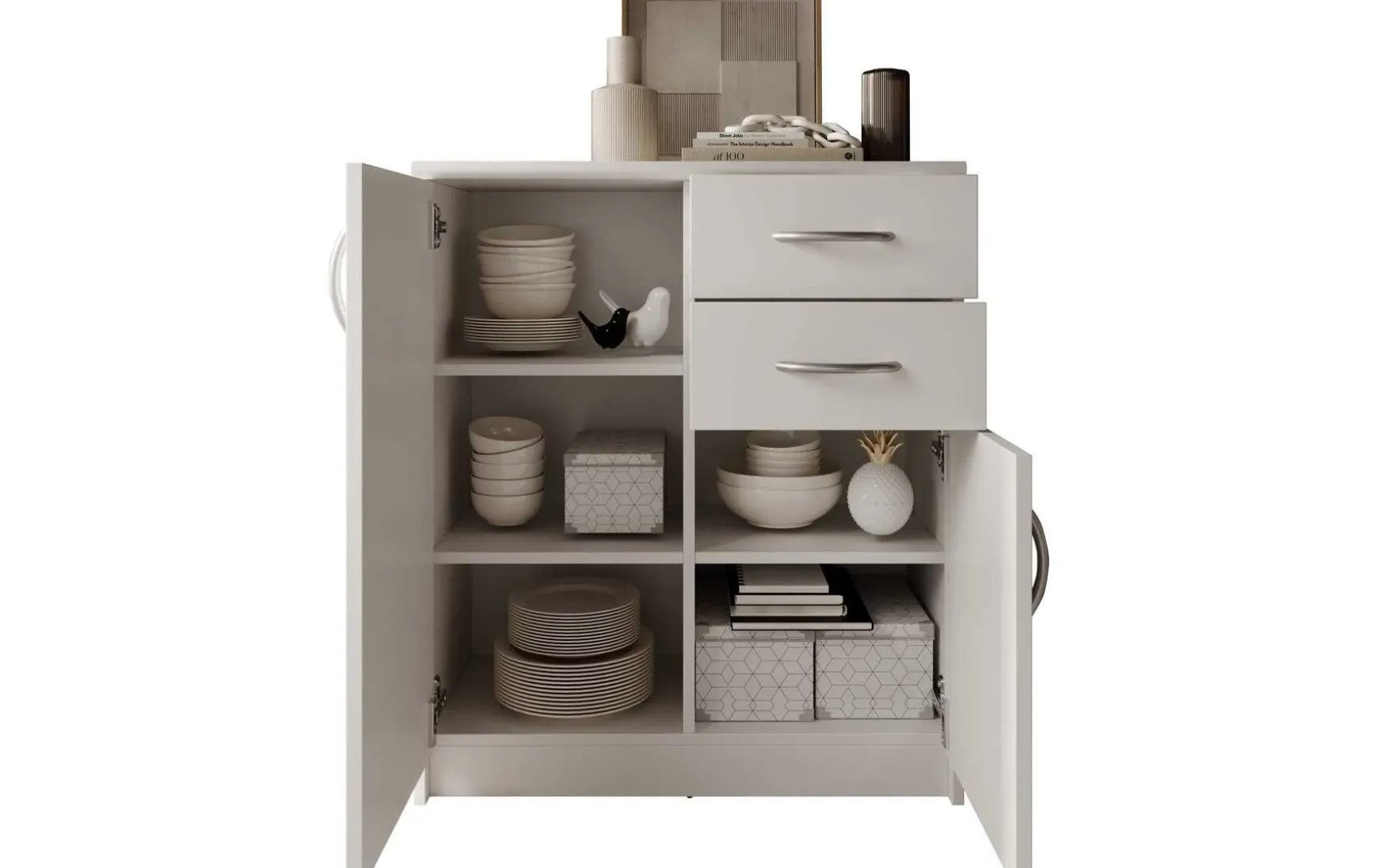 Mit ihrem schlichten aber zeitlos elegantem Design mit Dekor in Weiß fügt sich diese Kommode in jeden Wohnraum hervorragend ein. Hinter den beiden Türen verbergen sich insgesamt 3 höhenverstellbare Einlegeböden, die in Kombination mit den beiden Schubladen sehr viel Stauraum bieten.